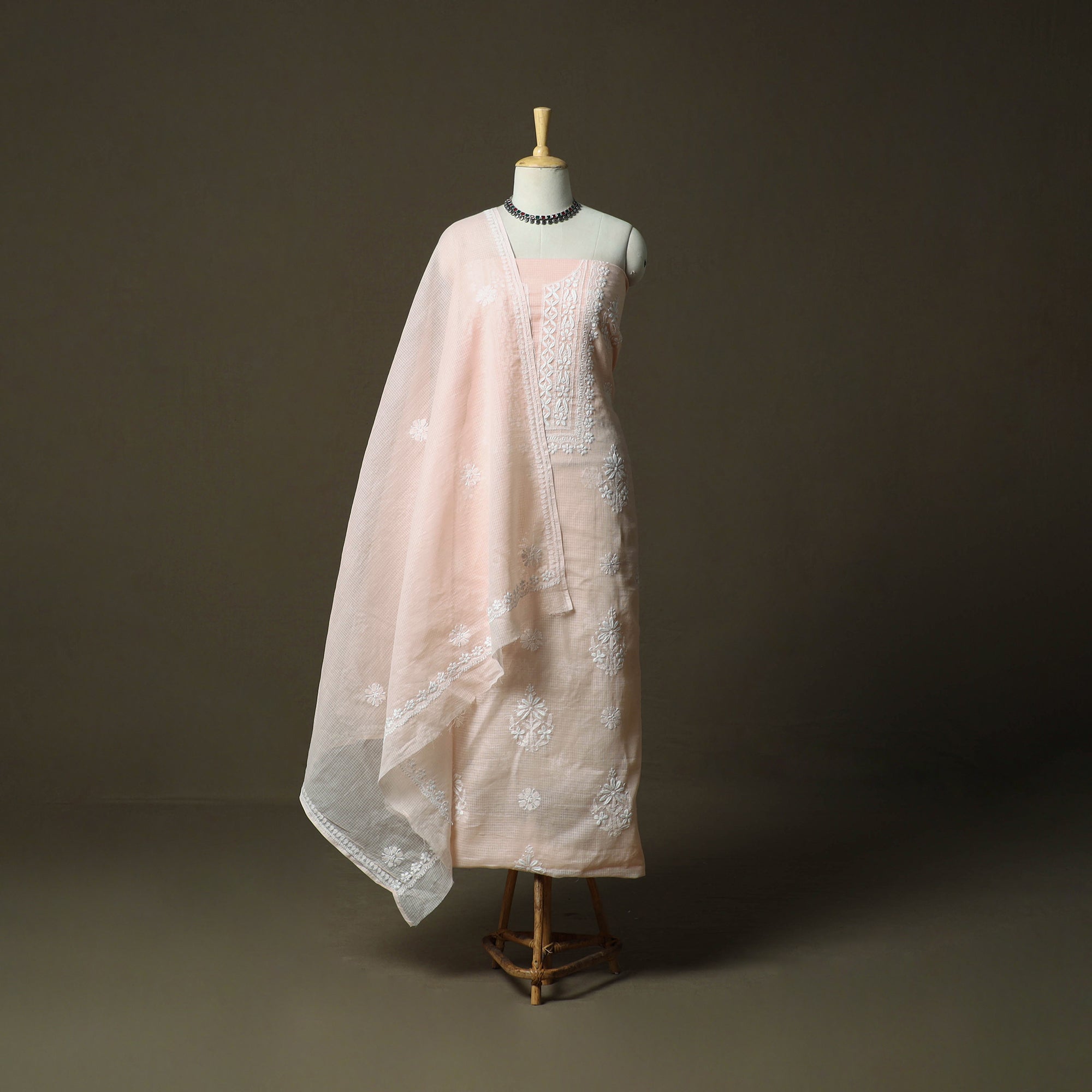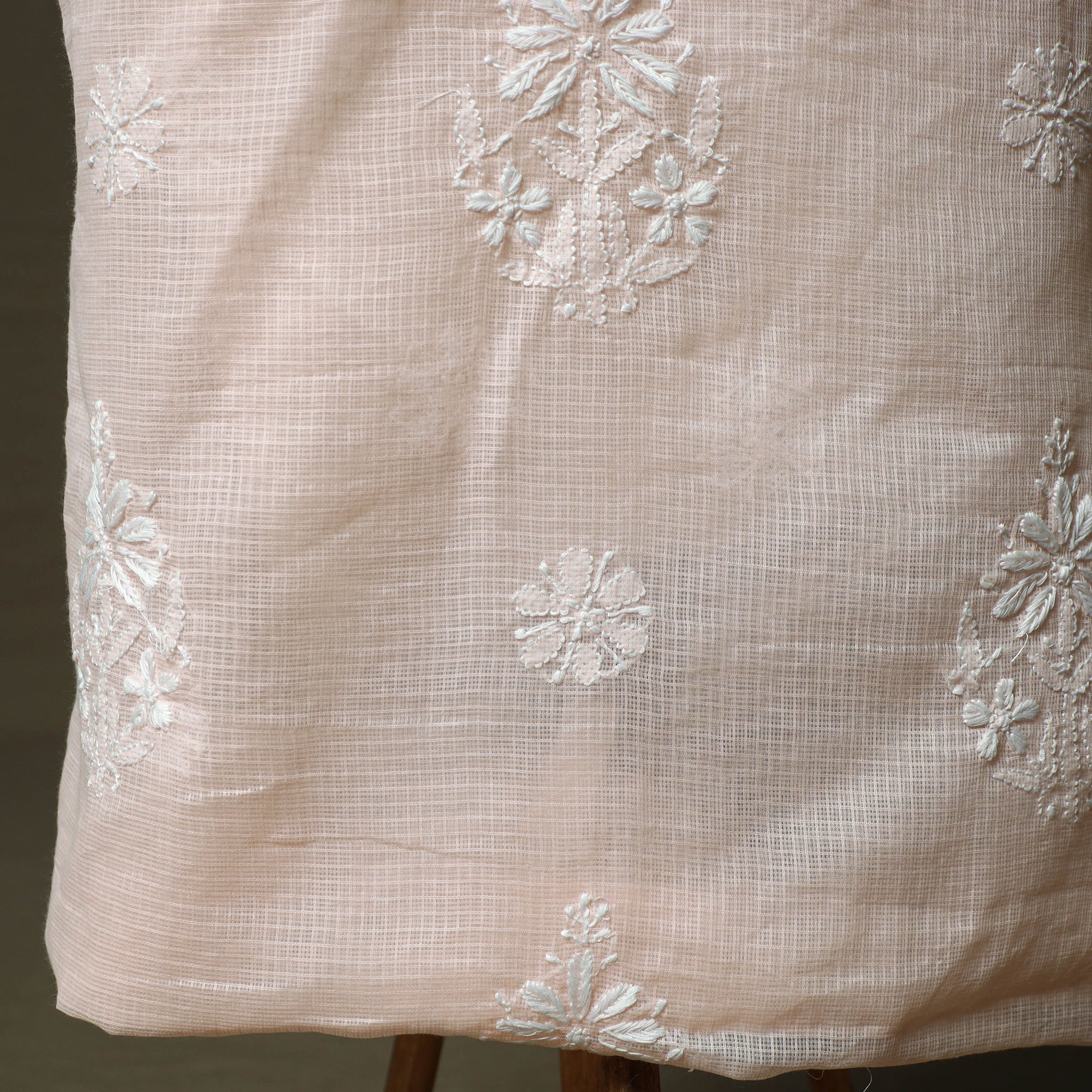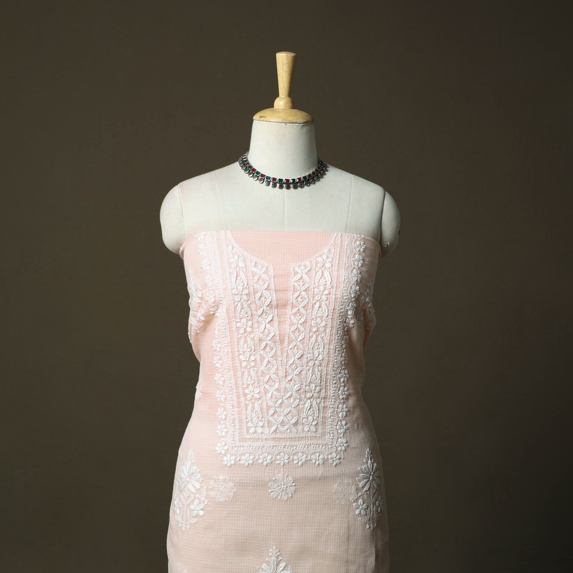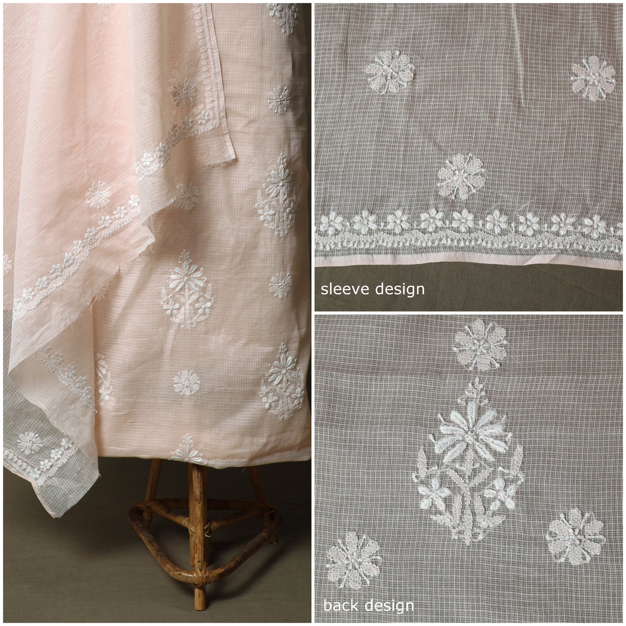 Traditional Lucknowi chikankari hand embroidered kota doria cotton 2pc unstitched dress material by Nazrana Chikan artisans. The fabric features delicate hand embroidery with soft pastel threads, forming elegant floral and paisley motifs. Detailed with ghas patti work, it showcases refined craftsmanship. The embroidery process takes several days and follows a 400 year old Lucknowi tradition rooted in patience, skill, and careful handwork. Kota doria is an age-old Indian textile produced in the Kota district of Rajasthan. The doria or the threads are finely interweaves to make the check patterns. Its lightweight and sheer texture giving an exquisite grace and elegance of its own. The set includes kurta fabric and matching dupatta. Suitable for weddings, special occasions, cultural gatherings and special evening wear.