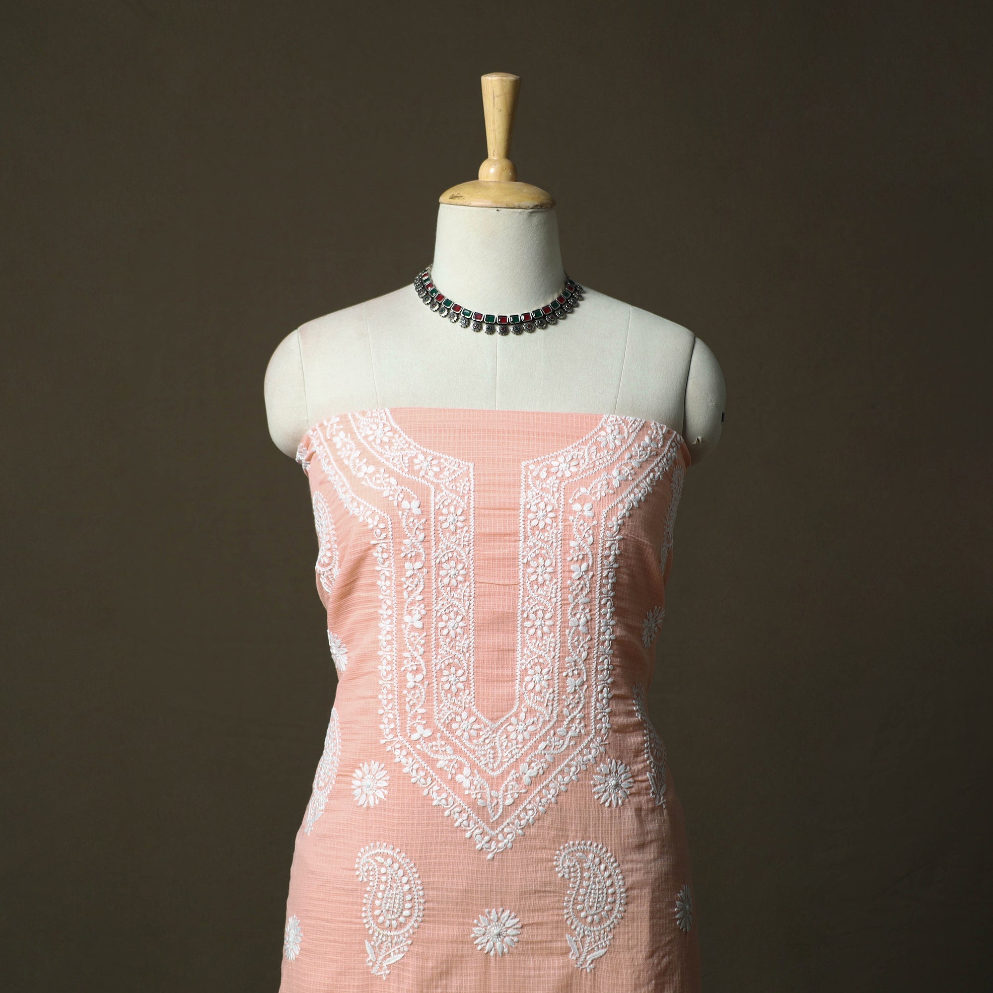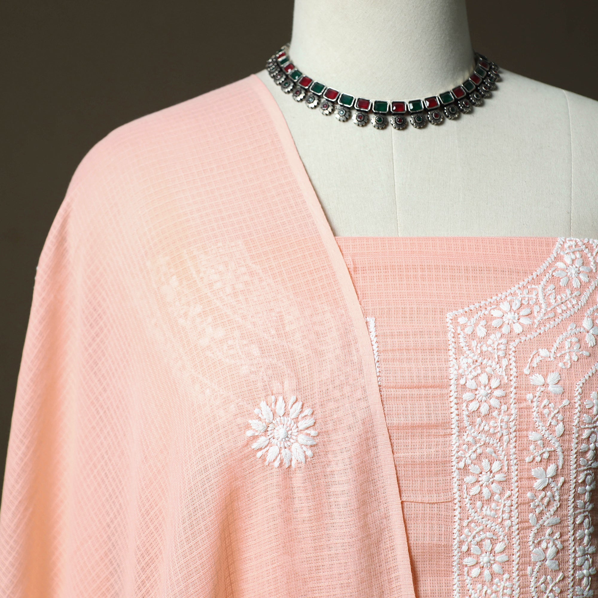 | Material | Traditional pink lucknowi chikankari hand embroidered kota doria cotton 2pc unstitched dress material by Nazrana Chikan artisans. The fabric features delicate hand embroidery with soft pastel threads, forming elegant floral and paisley motifs. Detailed with ghas patti work, it showcases refined craftsmanship. The embroidery process takes several days and follows a 400 year old Lucknowi tradition rooted in patience, skill, and careful handwork. Kota doria is an age-old Indian textile produced in the Kota district of Rajasthan. The doria or the threads are finely interweaves to make the check patterns. Its lightweight and sheer texture giving an exquisite grace and elegance of its own. The set includes kurta fabric and matching dupatta. Suitable for weddings, special occasions, cultural gatherings and special evening wear. |