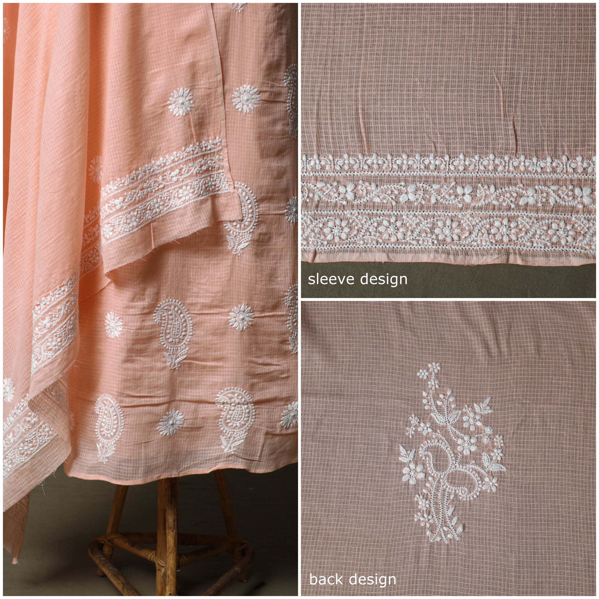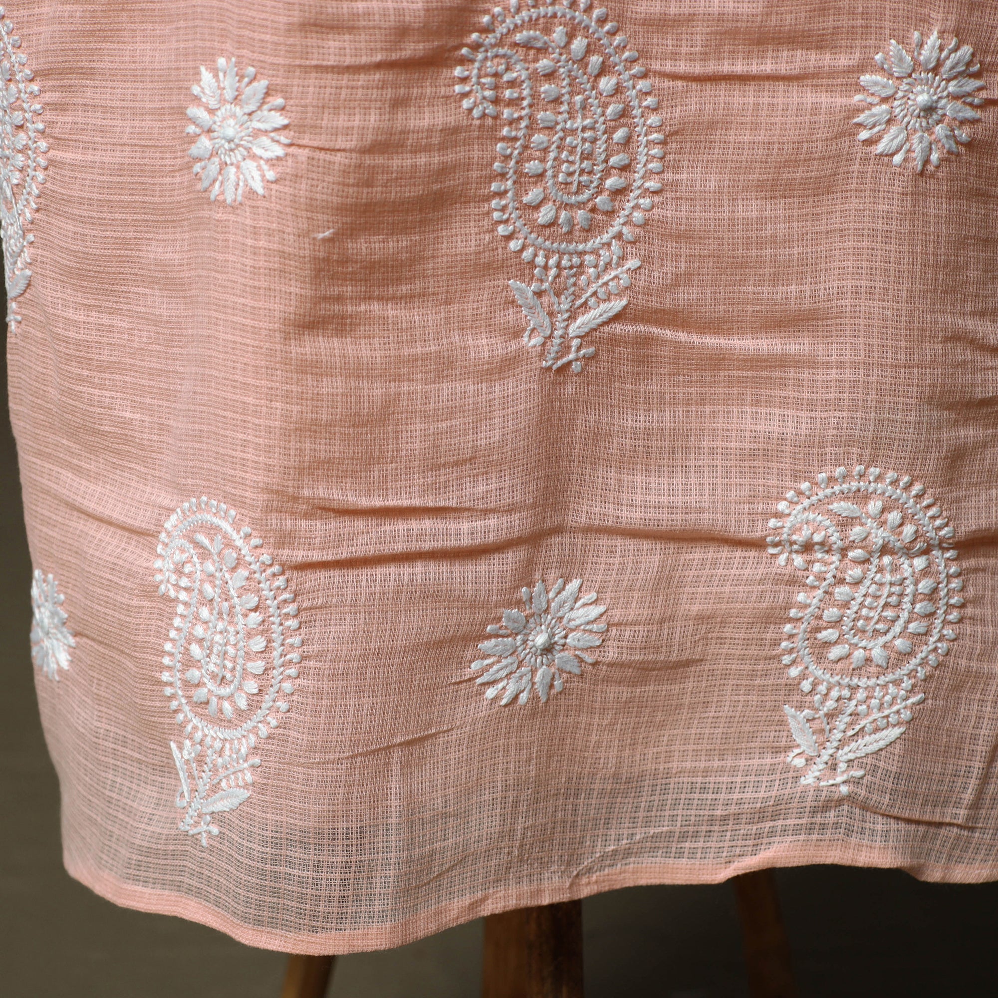 Delicate chikankari embroidery from Meharki Chikan—hand-embroidered kurtas and fabrics crafted by skilled women artisans in soft hues.