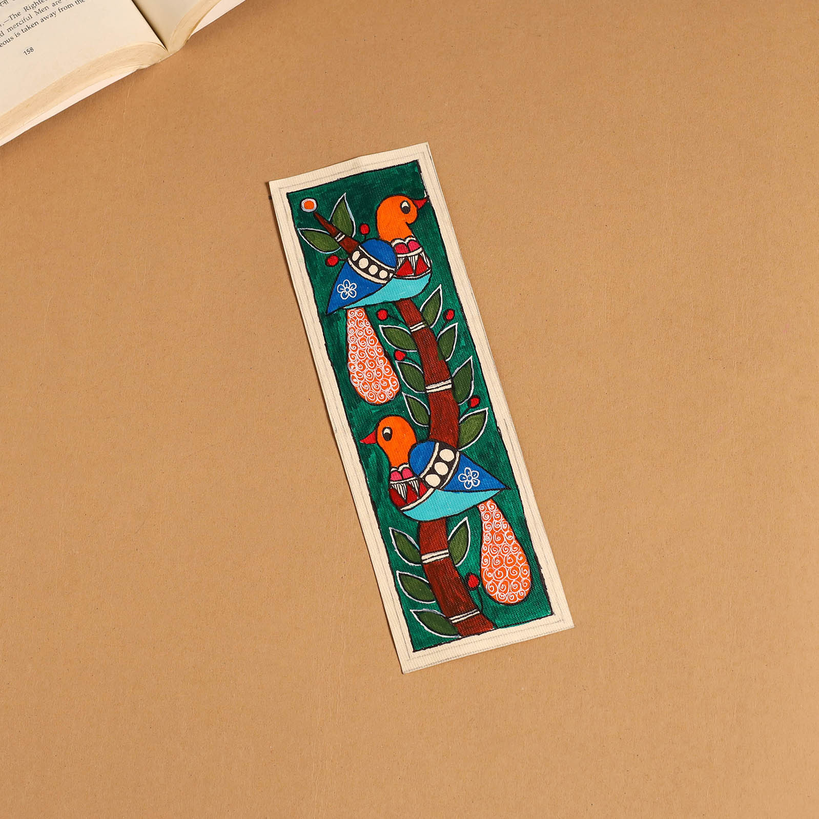 This madhubani hand-painted bookmark is crafted on handmade paper and painted with natural dyes. Created by master artisan Hira Devi from Bihar, it represents the world-famous Madhubani art, admired for its fine detailing, vibrant motifs, and storytelling rooted in nature and mythology. A perfect companion for your books, this bookmark brings tradition to your reading and makes a thoughtful keepsake for art lovers and book enthusiasts.
