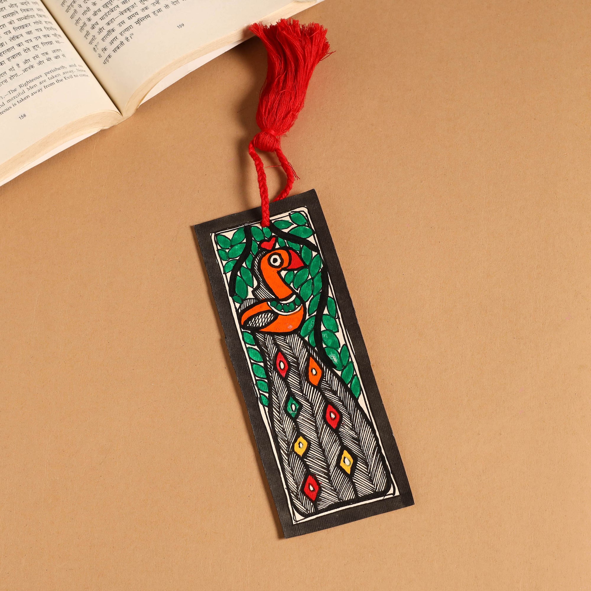 This madhubani hand-painted bookmark with tassel is crafted on handmade paper and painted with natural dyes. Made by master artisan Hira Devi from Bihar, it showcases the world-famous Madhubani art, celebrated for its fine lines, vibrant motifs, and storytelling rooted in nature and mythology. This bookmark adds a touch of tradition to your reading and makes a meaningful keepsake for book lovers and art enthusiasts.