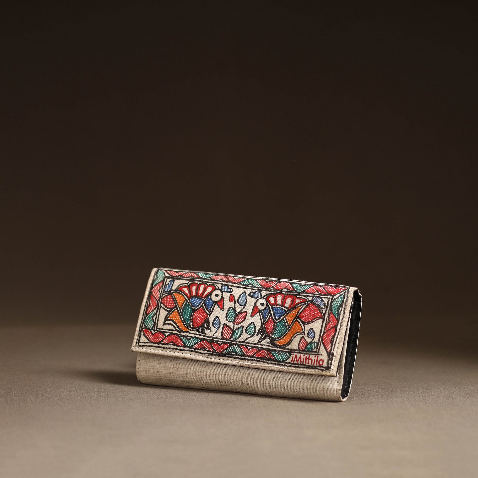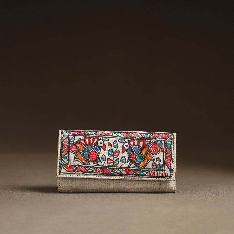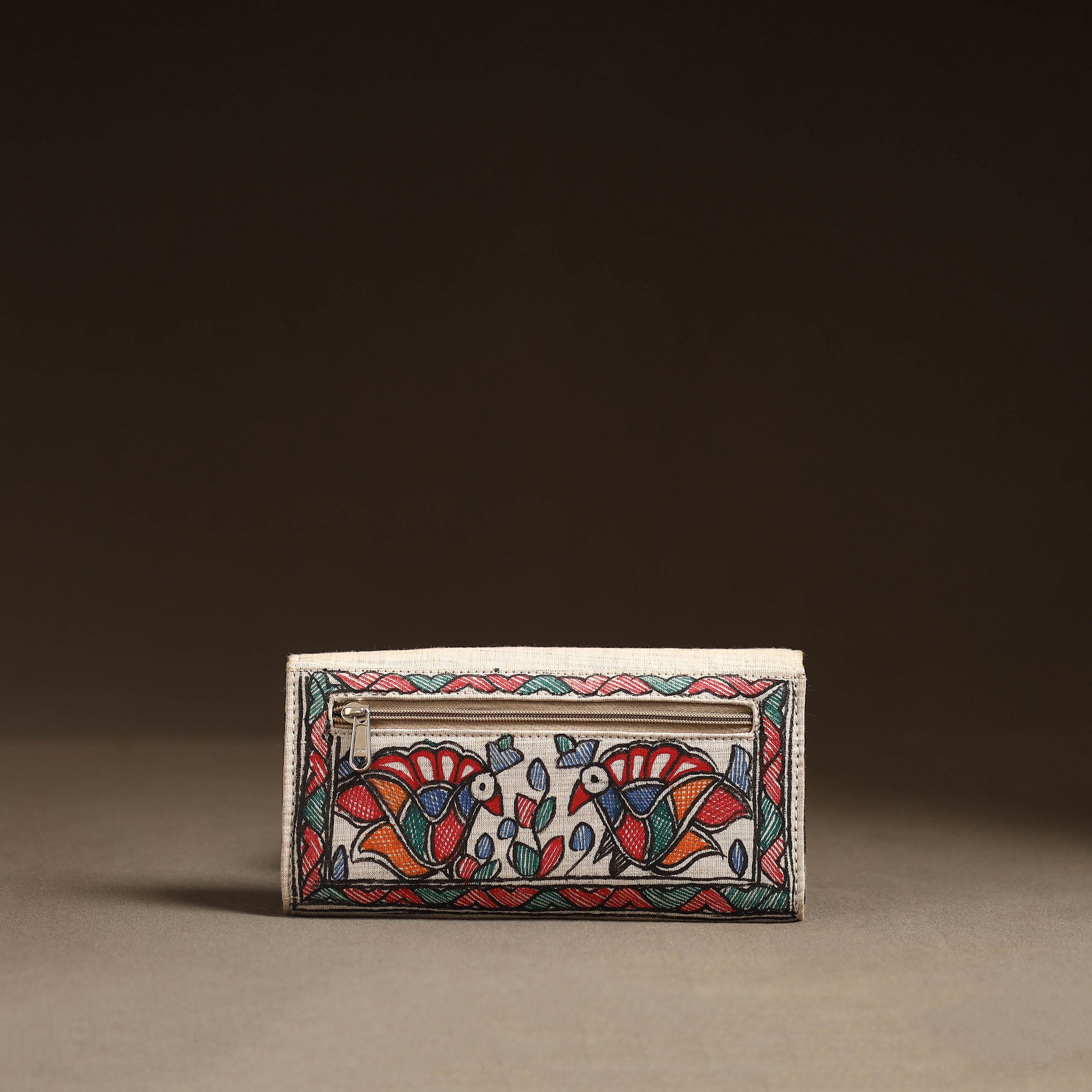 Multicolor madhubani clutch is made from cotton and handpainted with representations of traditional Mithila art by Ruchi Jha from Bihar. It has four card slots, one zipper and one simple pocket with spill-proof plastic layer lining inside and one zipper pocket on backside. Madhubani artworks are created using natural dye. ideal for keeping your essentials organized.