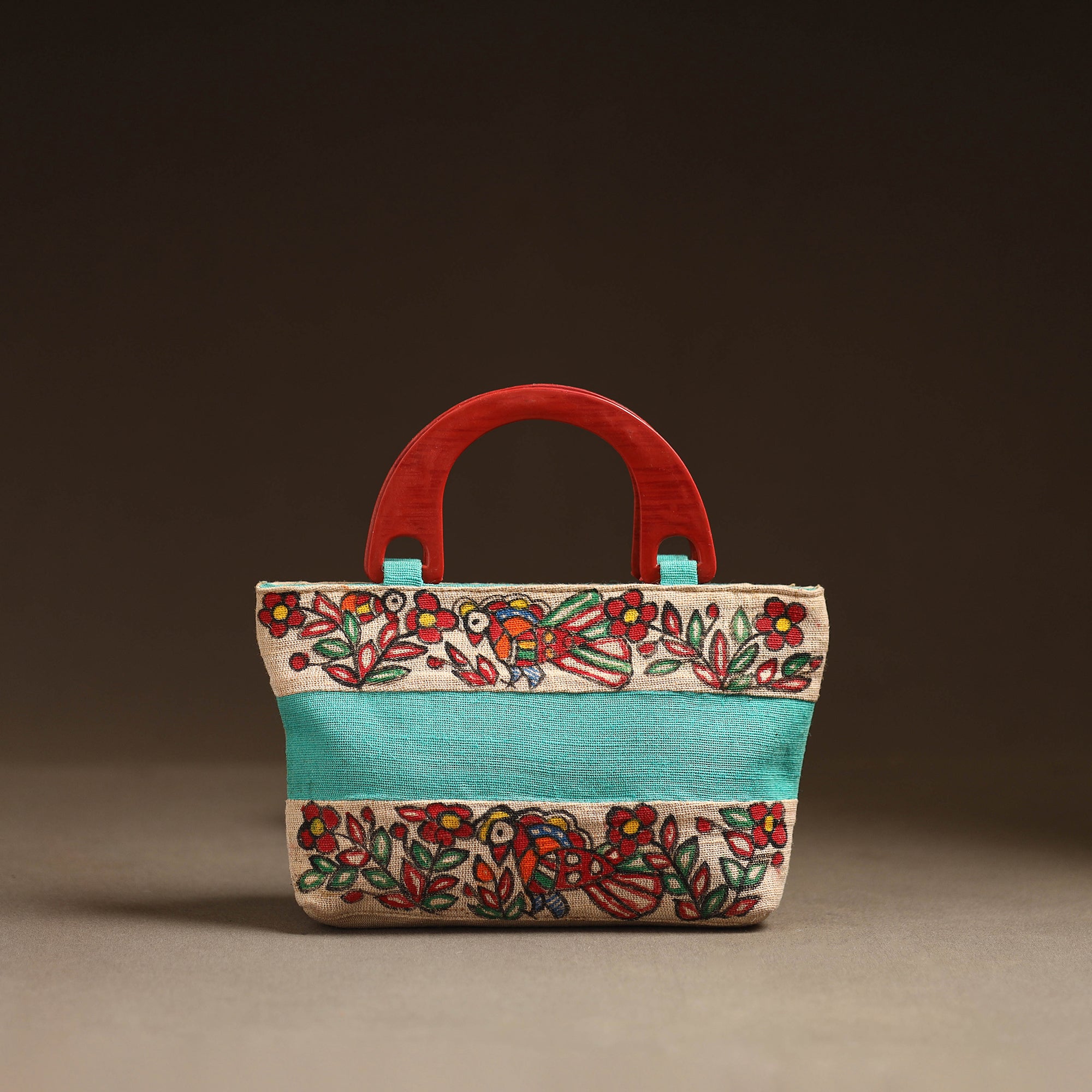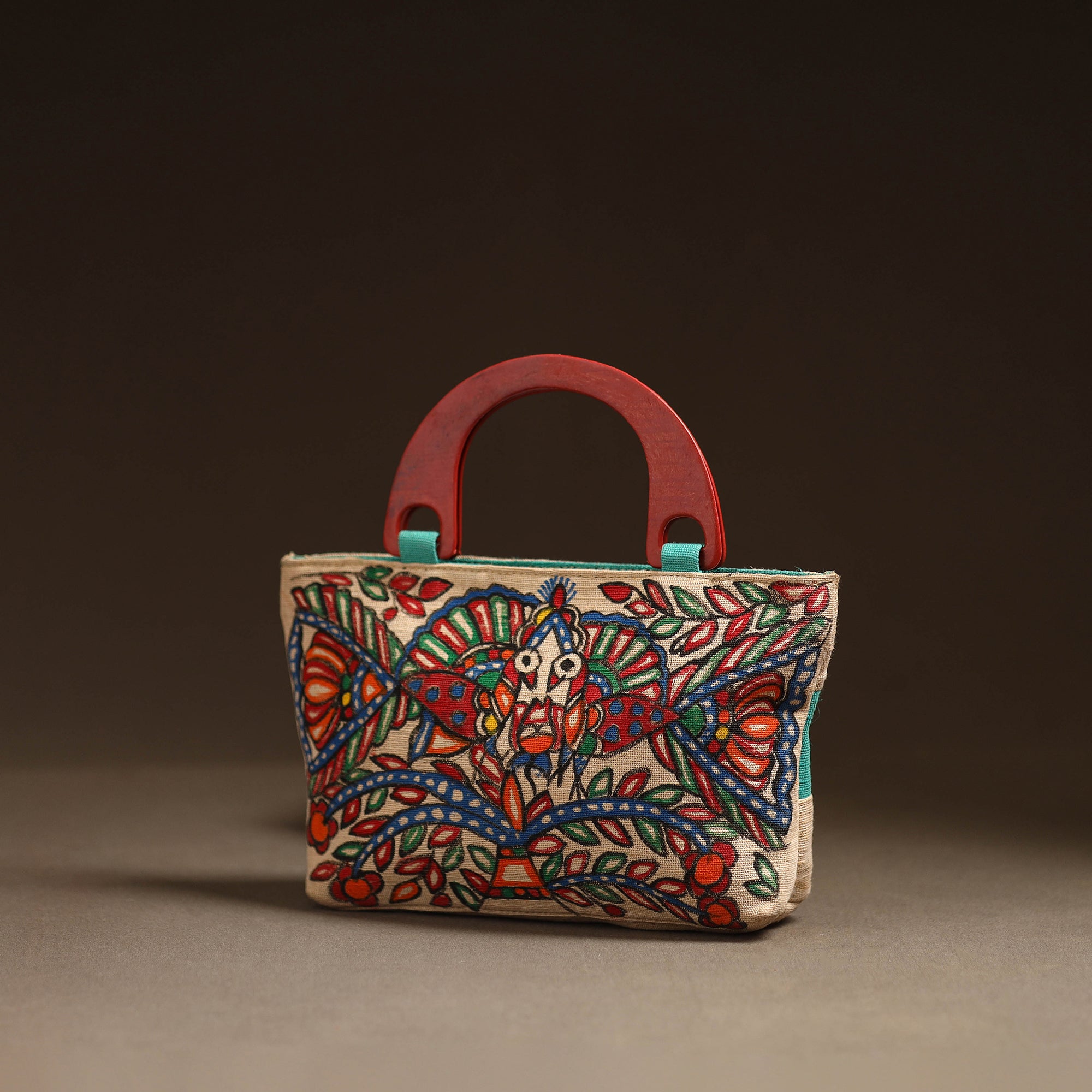 Multicolor madhubani handbag is made from jute cotton and handpainted with representations of traditional Mithila art by Ruchi Jha from Bihar. It has one zipper pocket inside, a spill-proof plastic layer lining inside, and fiber handle. Madhubani artworks are created using natural dye. ideal for keeping your essentials organized.