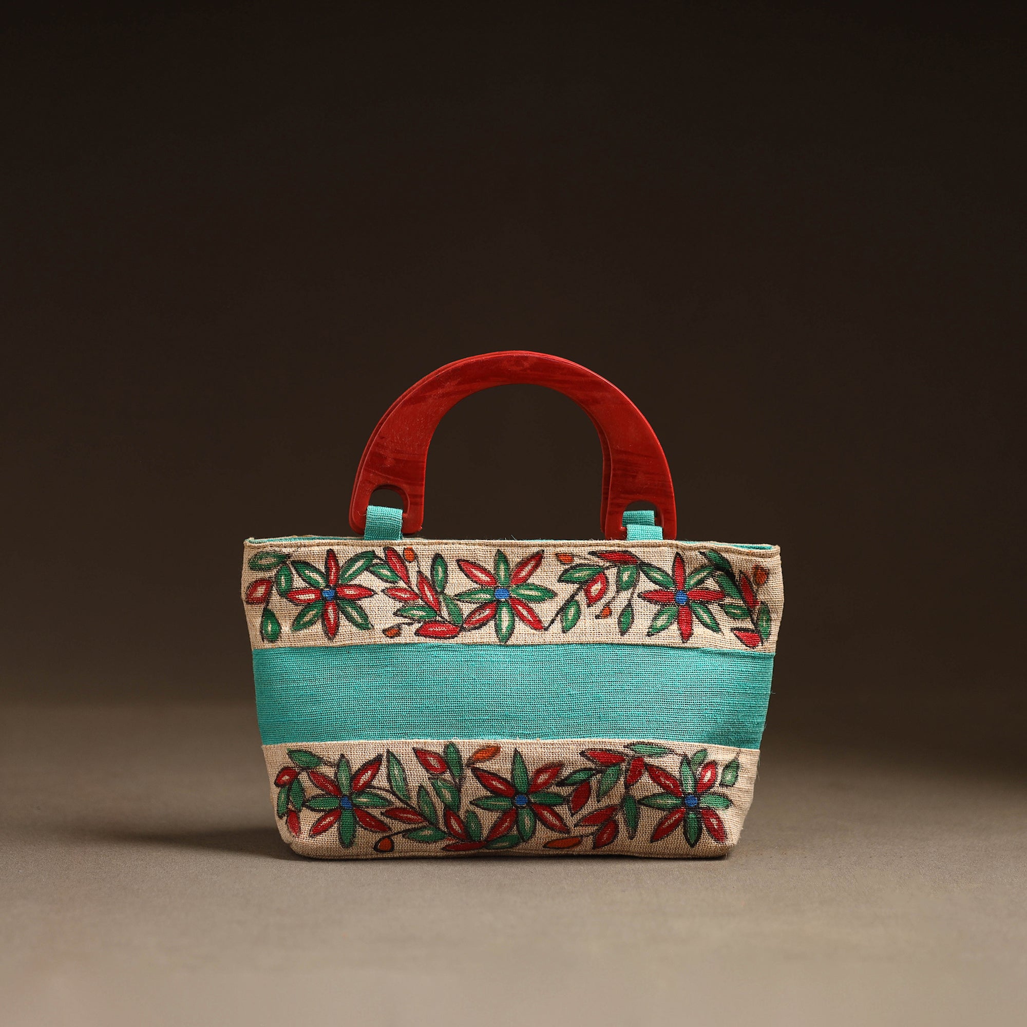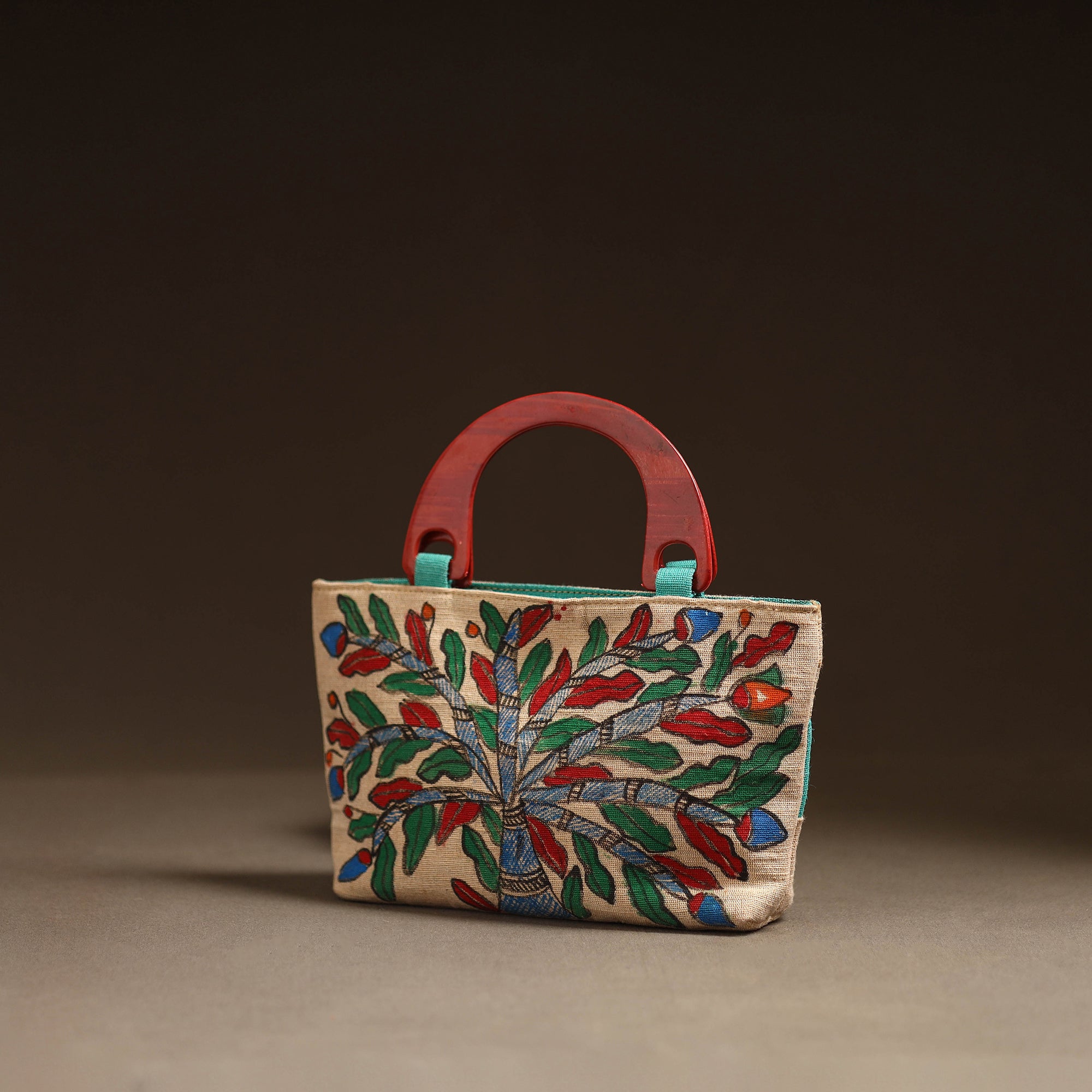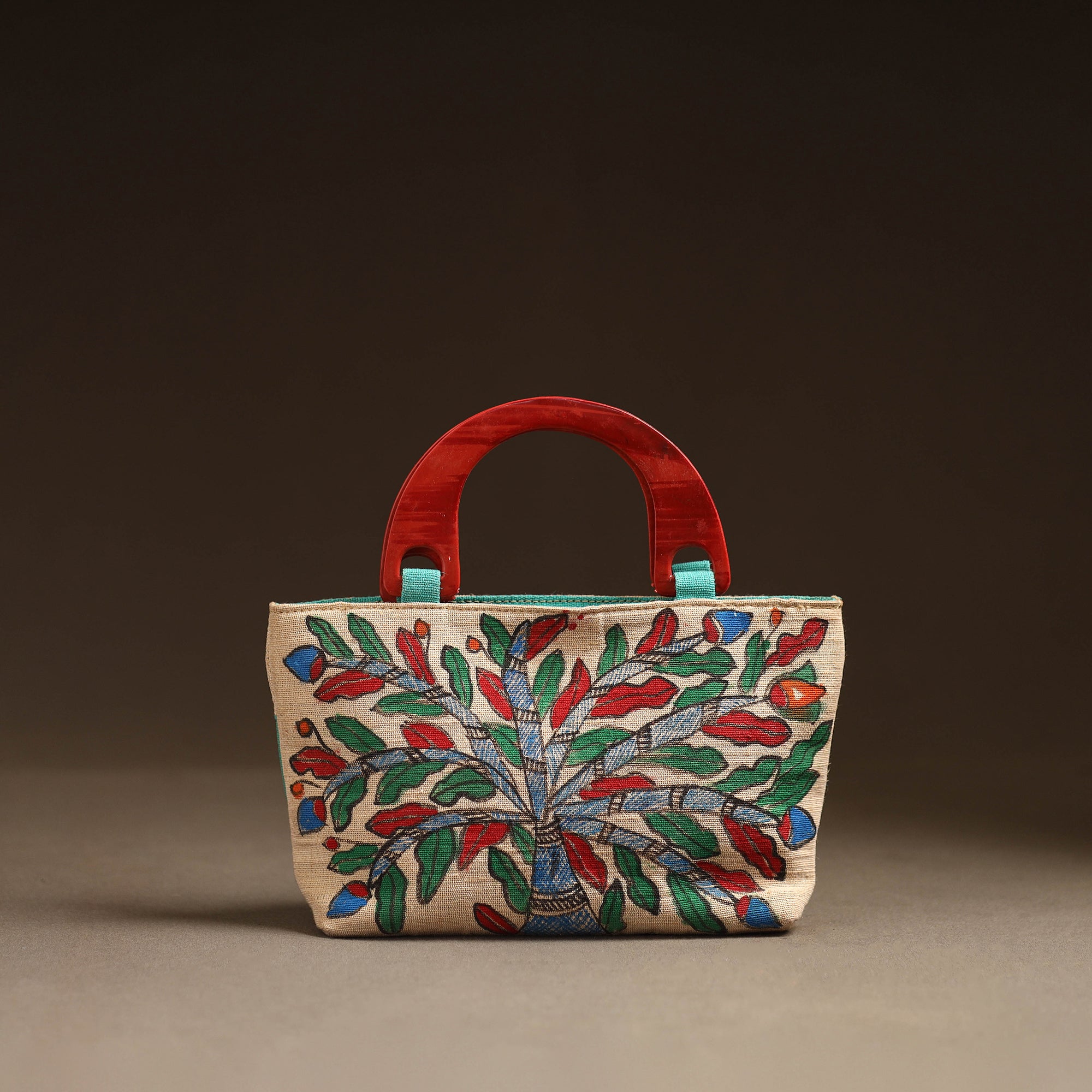 Madhubani handbag is made from jute cotton and handpainted with representations of traditional Mithila art by Ruchi Jha from Bihar. It has one zipper pocket inside, a spill-proof plastic layer lining inside, and fiber handle. Madhubani artworks are created using natural dye. ideal for keeping your essentials organized.