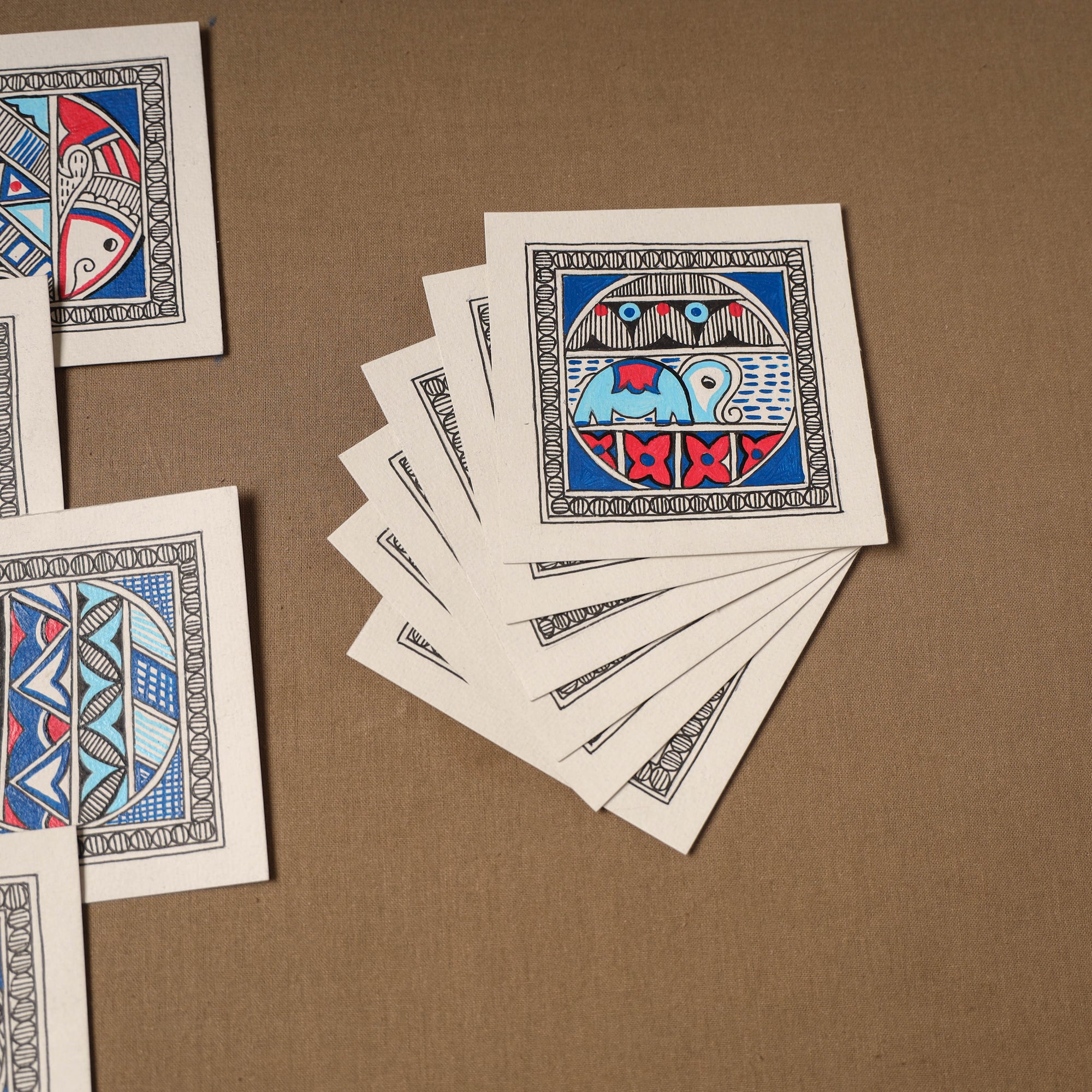 Blue madhubani handpainted wall decor cards (set of 10) crafted on handmade paper using acrylic colors by Vidushi Tamrakar. Each card reflects the madhubani art, Known for its fine lines and visual narratives inspired by nature and mythology. These cards are ideal wall decor items for the living room and bedroom.
