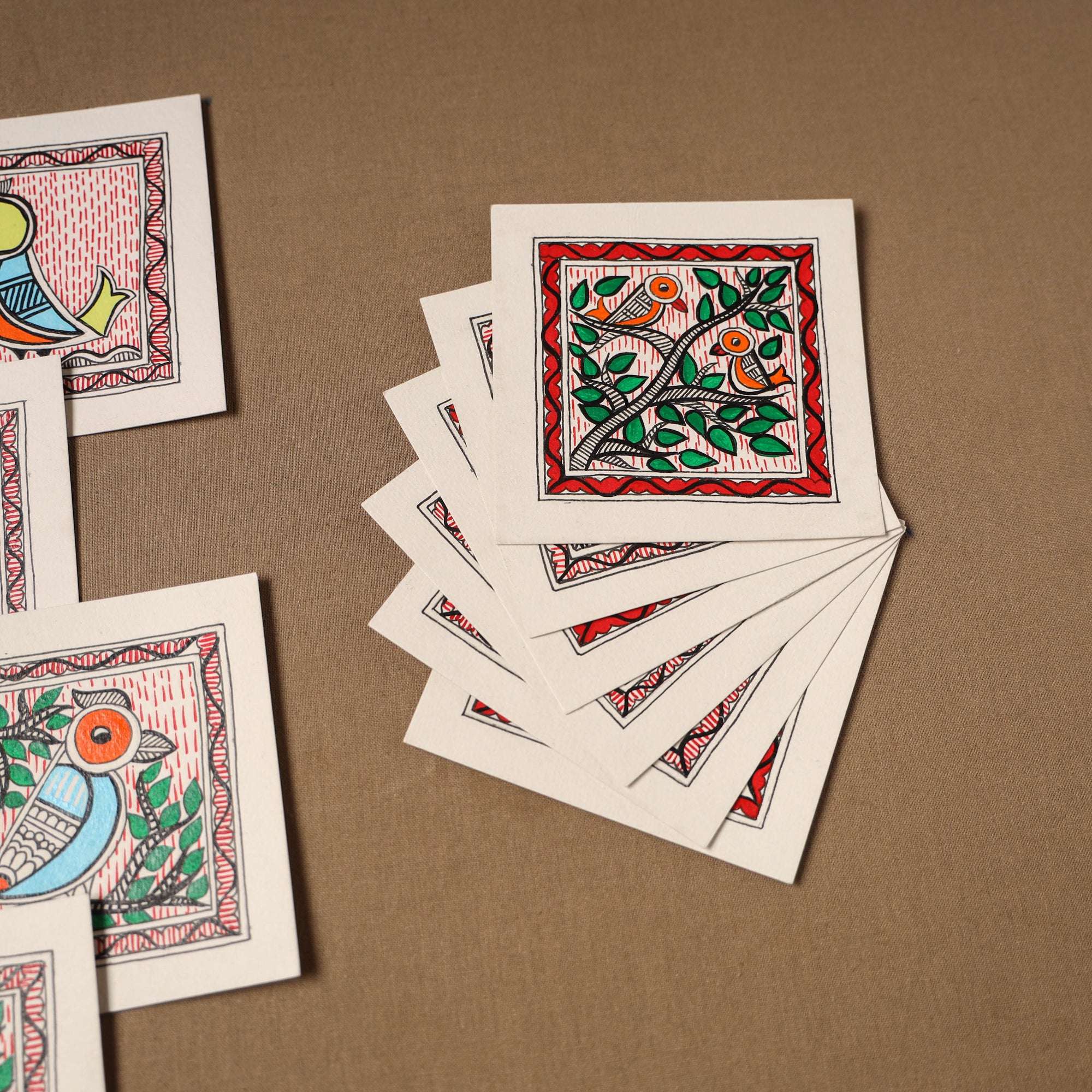 Multicolor madhubani handpainted wall decor cards (set of 10) crafted on handmade paper using acrylic colors by Vidushi Tamrakar. Each card reflects the madhubani art, Known for its fine lines and visual narratives inspired by nature and mythology. These cards are ideal wall decor items for the living room and bedroom.