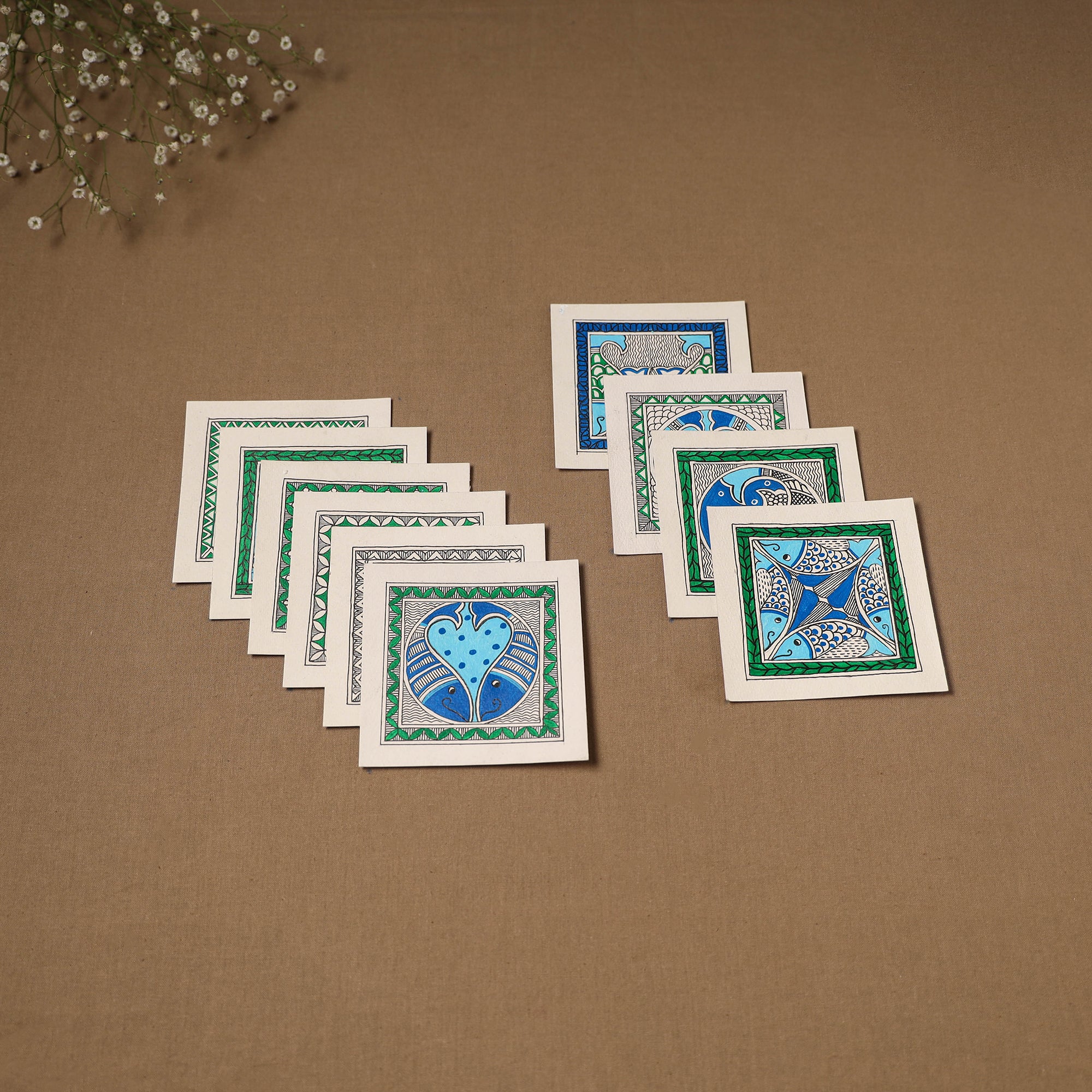 Blue madhubani handpainted wall decor cards (set of 10) crafted on handmade paper using acrylic colors by Vidushi Tamrakar. Each card reflects the madhubani art, Known for its fine lines and visual narratives inspired by nature and mythology. These cards are ideal wall decor items for the living room and bedroom.