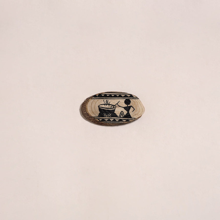 Brown handpainted fridge magnet crafted on wood using acrylic colors. It showcases the warli art known for its simple geometric figures and scenes of daily life. This magnet adds a touch of art and charm to your fridge or any metal surface.