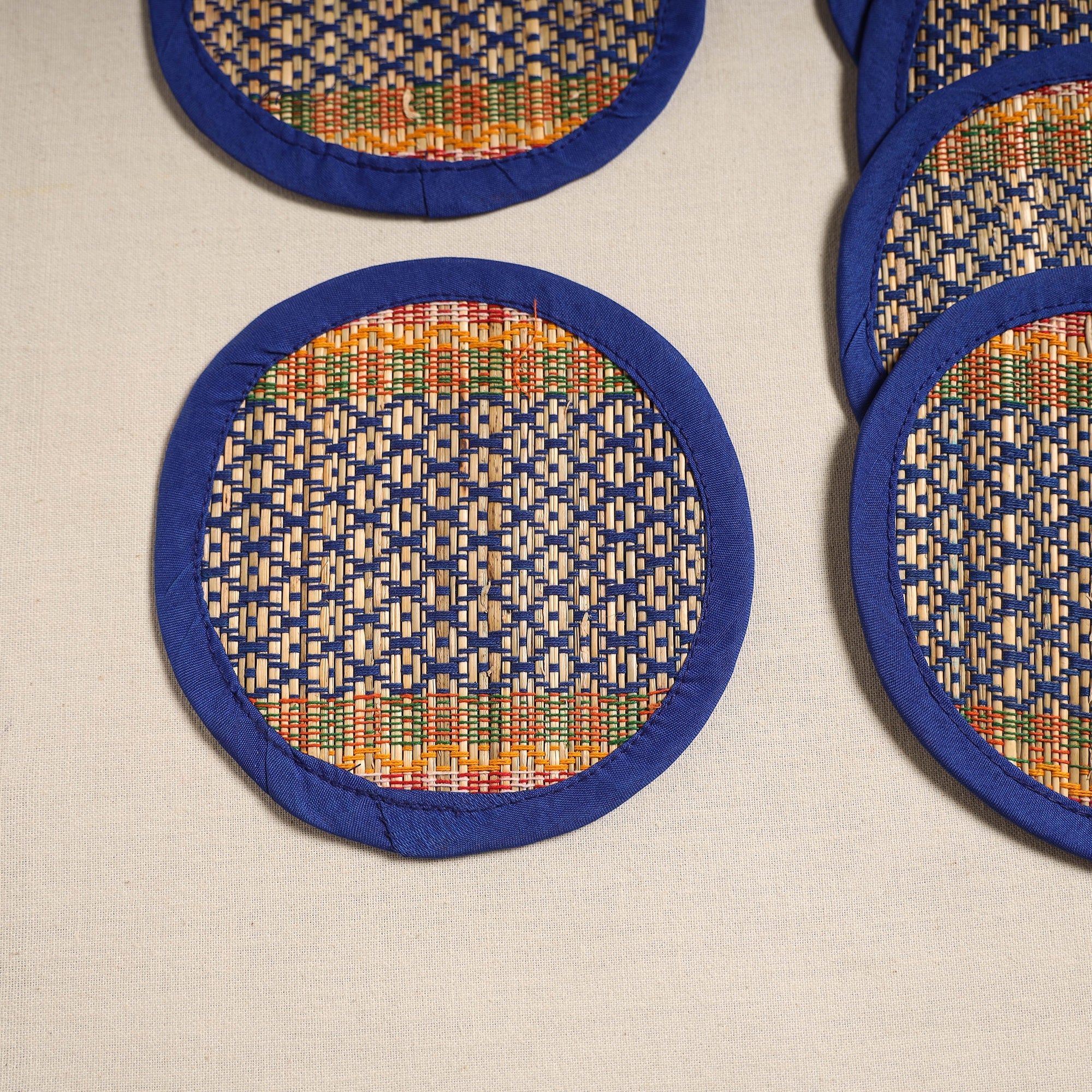 These blue table coasters are woven from natural madur grass twisted cotton yarn and madur kathi reed (Cyperus tegetum and C. pangorei), which grow in the swampy regions around Midnapore in West Bengal. This grass variety is among the most widely used for madur weaving in the state. The craft is practised in small artisan homes and workshops often with family members working together. These coasters help protect surfaces from heat stains, and moisture while adding a simple, earthy touch to everyday dining.