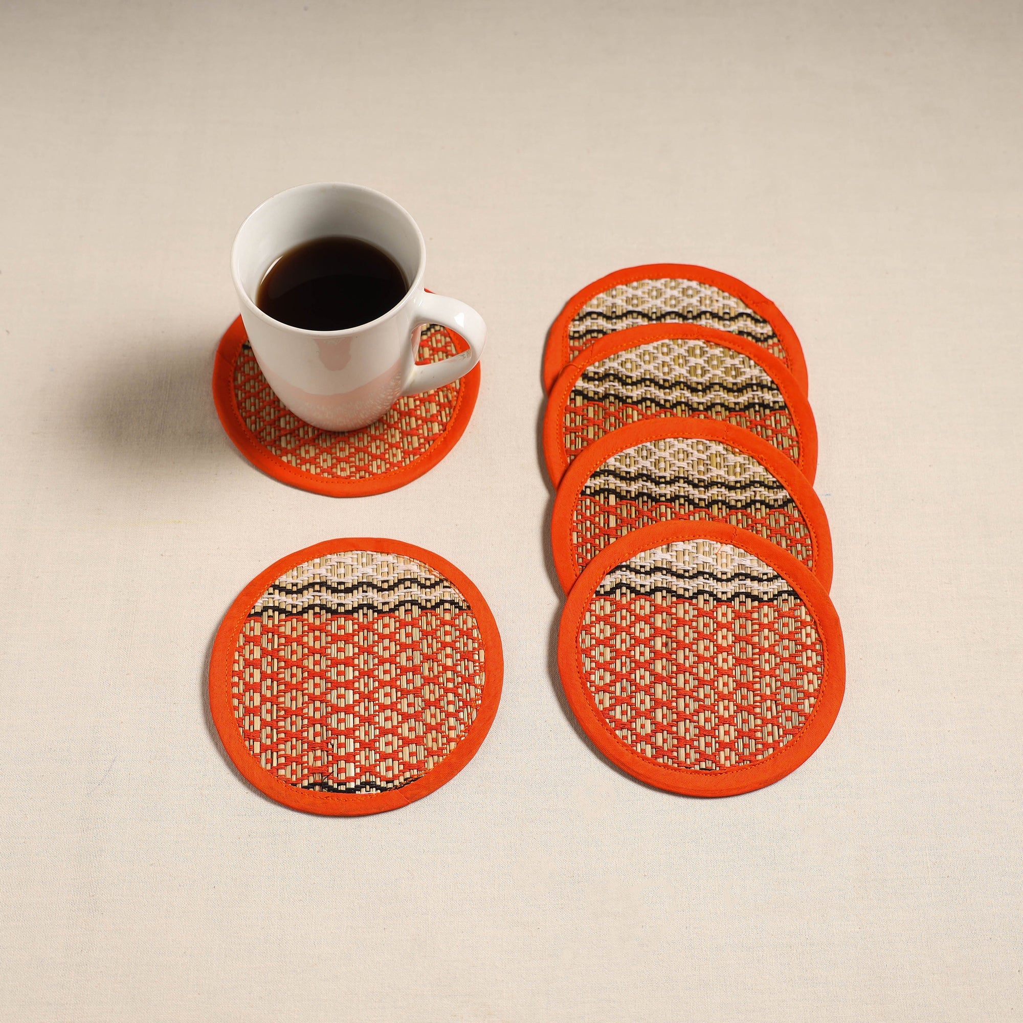 These orange table coasters are woven from natural madur grass twisted cotton yarn and madur kathi reed (Cyperus tegetum and C. pangorei), which grow in the swampy regions around Midnapore in West Bengal. This grass variety is among the most widely used for madur weaving in the state. The craft is practised in small artisan homes and workshops often with family members working together. These coasters help protect surfaces from heat stains, and moisture while adding a simple, earthy touch to everyday dining.