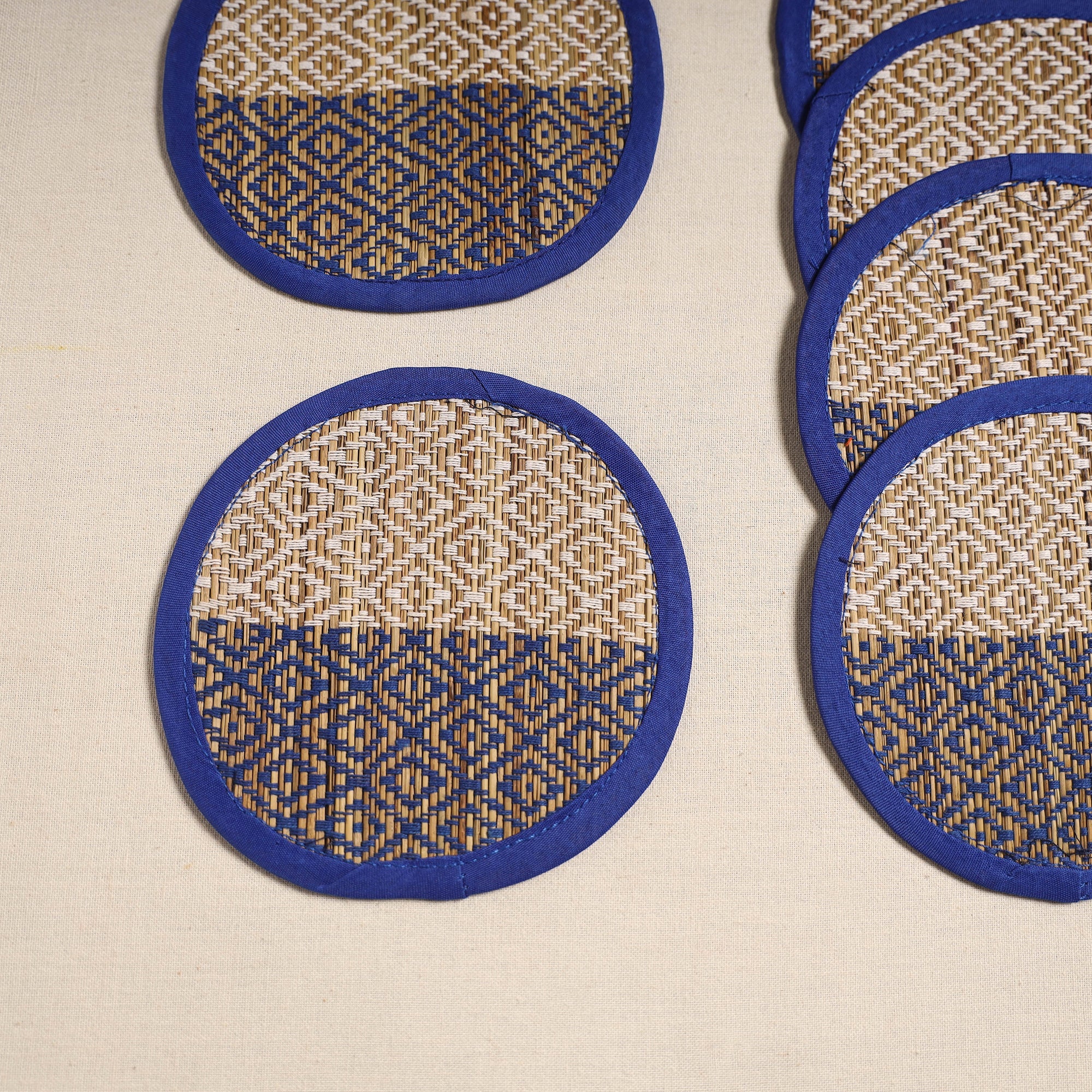 These blue table coasters are woven from natural madur grass twisted cotton yarn and madur kathi reed (Cyperus tegetum and C. pangorei), which grow in the swampy regions around Midnapore in West Bengal. This grass variety is among the most widely used for madur weaving in the state. The craft is practised in small artisan homes and workshops often with family members working together. These coasters help protect surfaces from heat stains, and moisture while adding a simple, earthy touch to everyday dining.