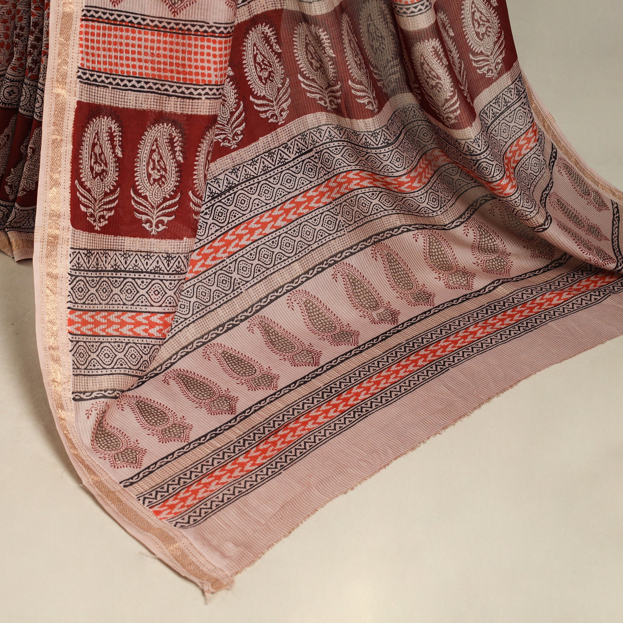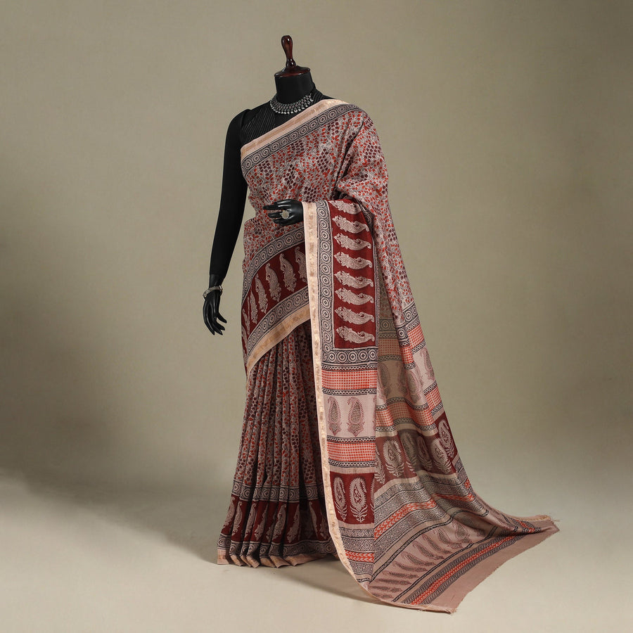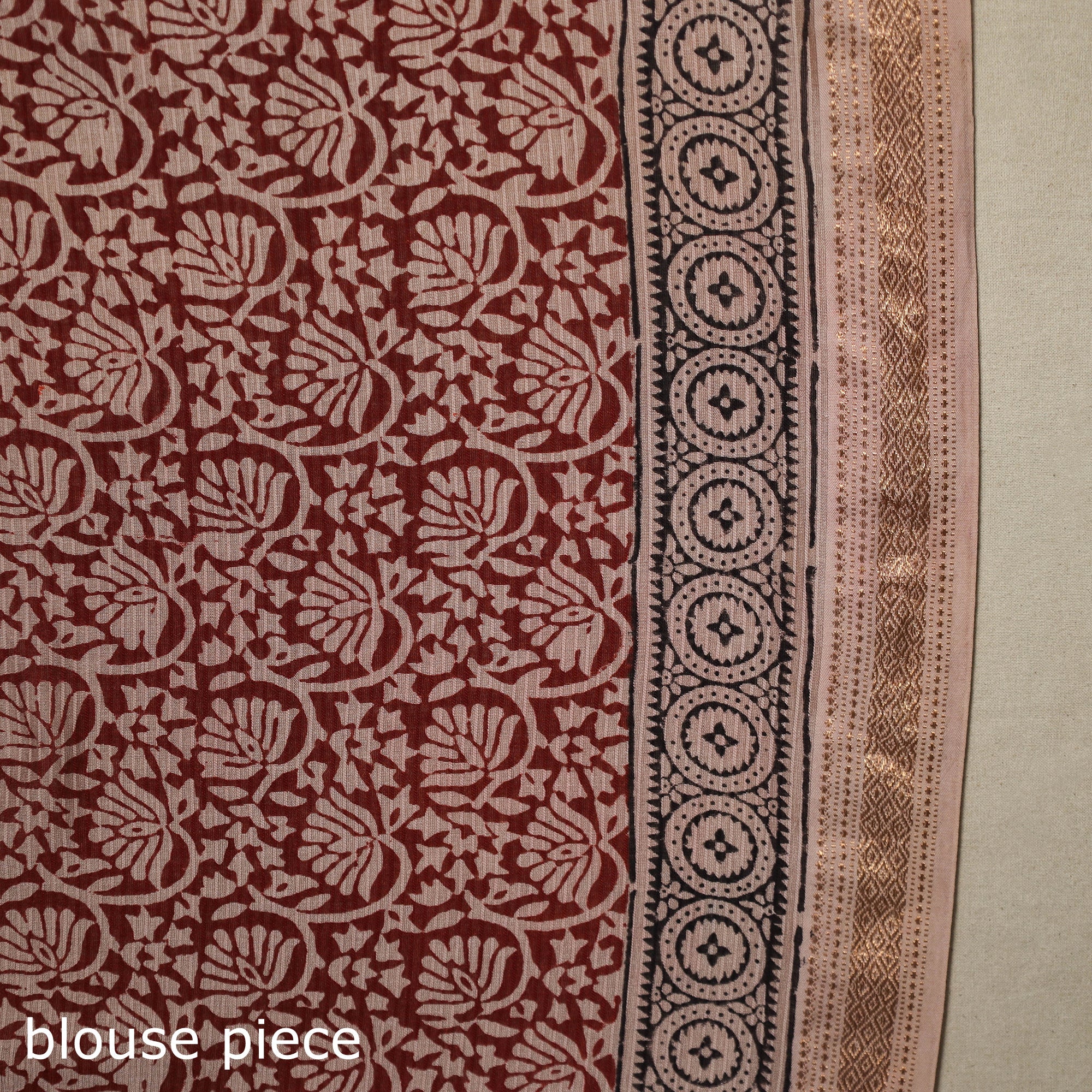 This red bagh maheshwari silk cotton saree with zari border comes from Madhya Pradesh. It is hand block-printed with detailed patterns and dyed in rich azo-free colours. Light and easy to wear, it carries the charm of traditional Indian weaving with a modern touch. Suitable for festivals, daily wear, or gifting, this saree adds grace and cultural value to any wardrobe, making it a meaningful and stylish choice.