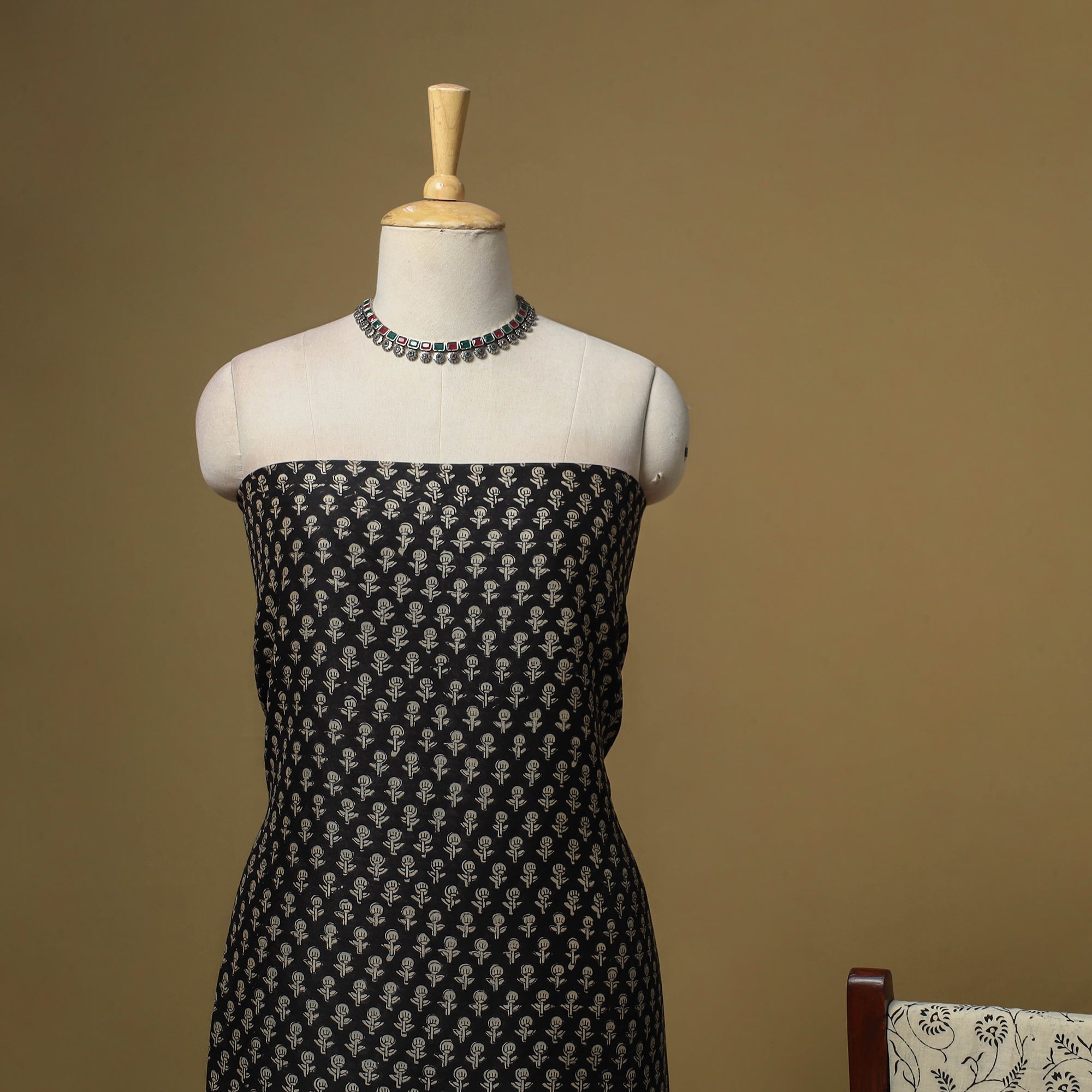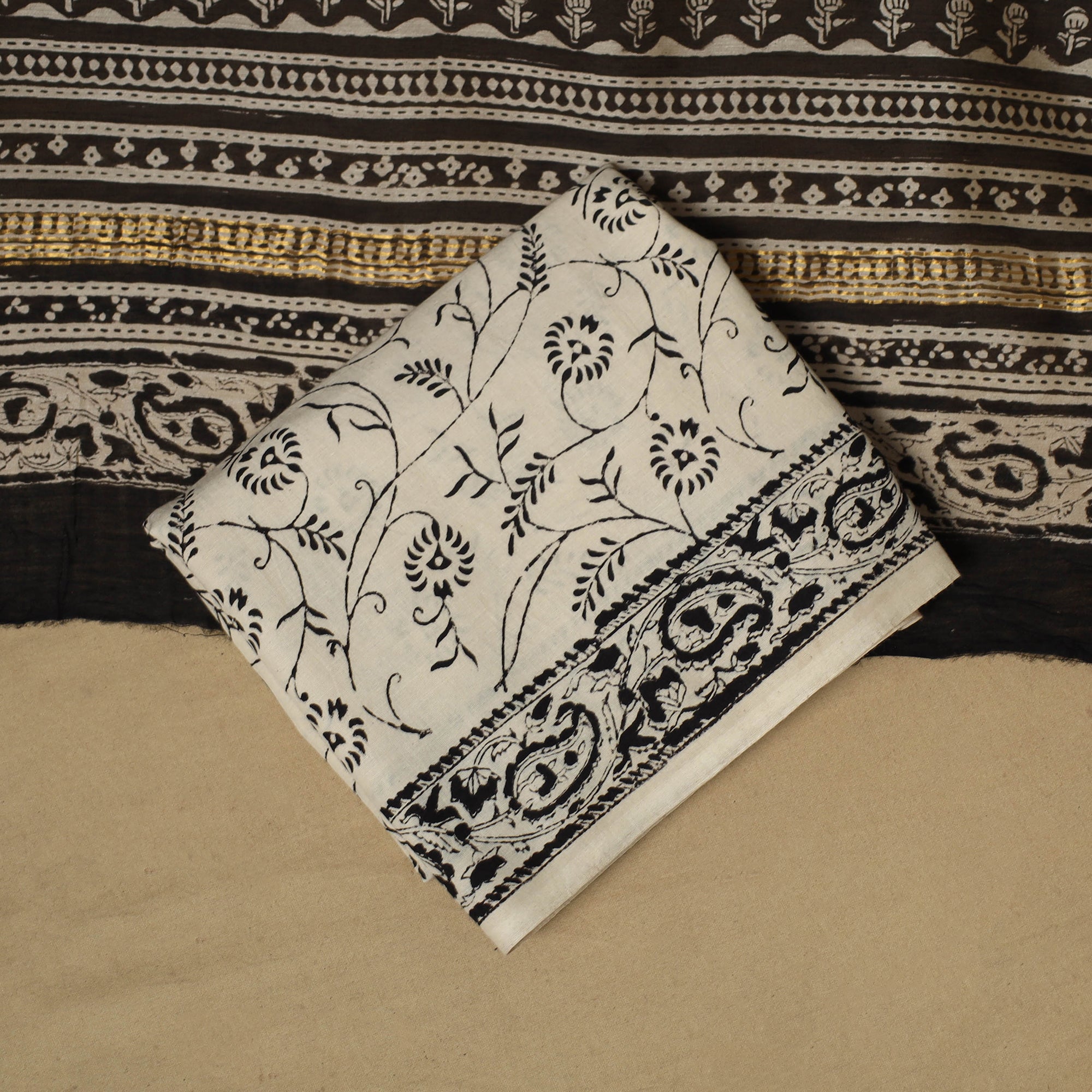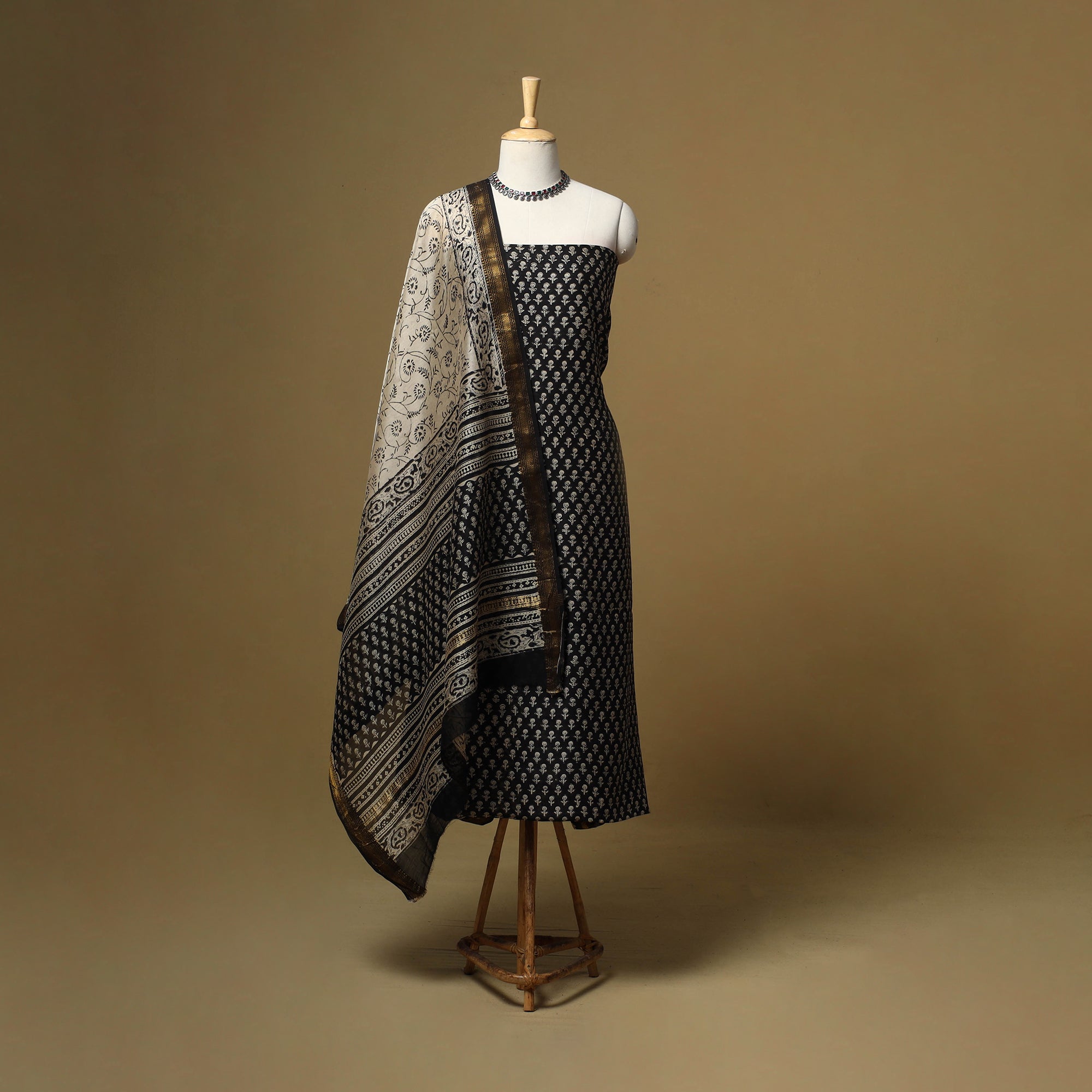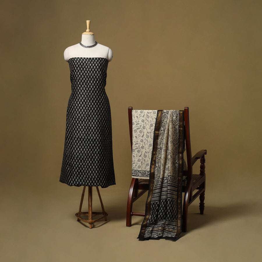 Black bagru hand block print natural dyed maheshwari silk-cotton 3pc unstitched dress material with zari border, using the traditional bagru hand block printing technique practiced by skilled artisans of Bagru, Rajasthan for over 400–450 years. The fabric is created by applying a hand-prepared mud resist with carved wooden blocks. After dyeing, the resist is washed away to reveal distinct patterns. The set includes kurta fabric, matching dupatta and a cotton bottom, which can be easily tailored into your preferred style.