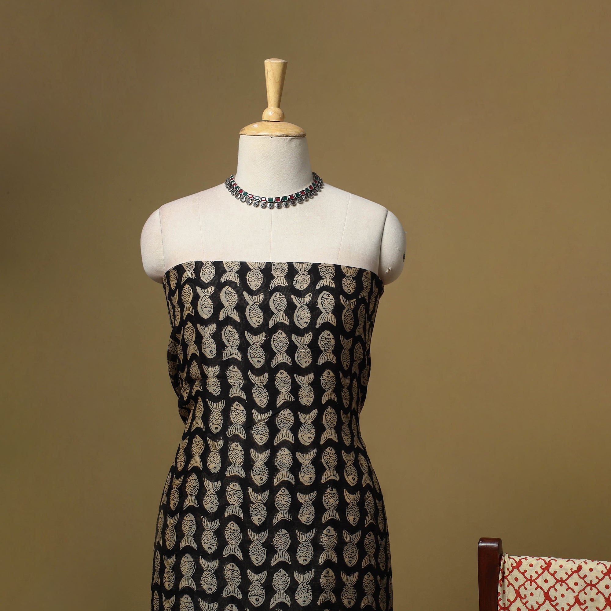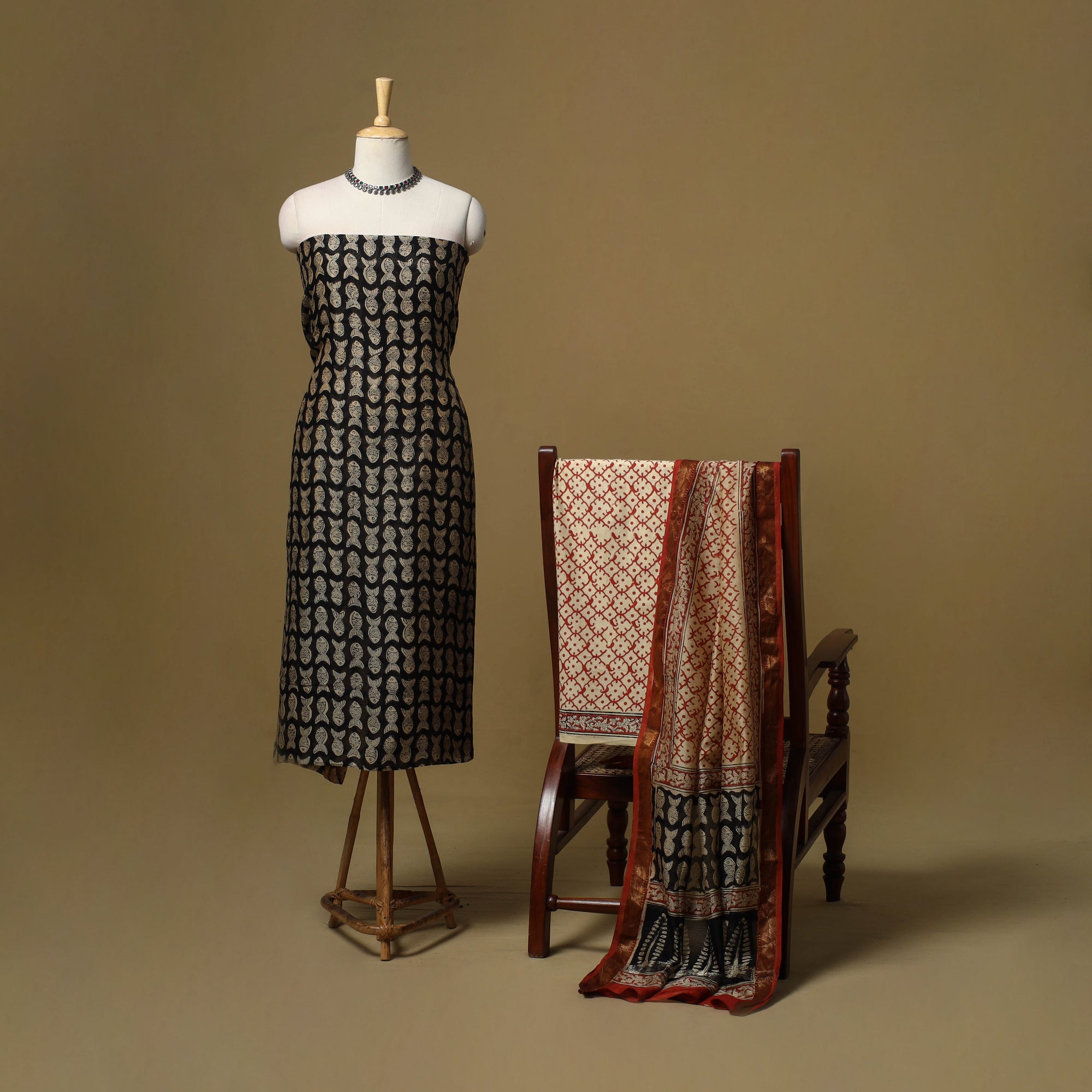 Bagru hand block print natural dyed maheshwari silk-cotton 3pc unstitched dress material with zari border, using the traditional bagru hand block printing technique practiced by skilled artisans of Bagru, Rajasthan for over 400–450 years. The fabric is created by applying a hand-prepared mud resist with carved wooden blocks. After dyeing, the resist is washed away to reveal distinct patterns. The set includes kurta fabric, matching dupatta and a cotton bottom, which can be easily tailored into your preferred style.