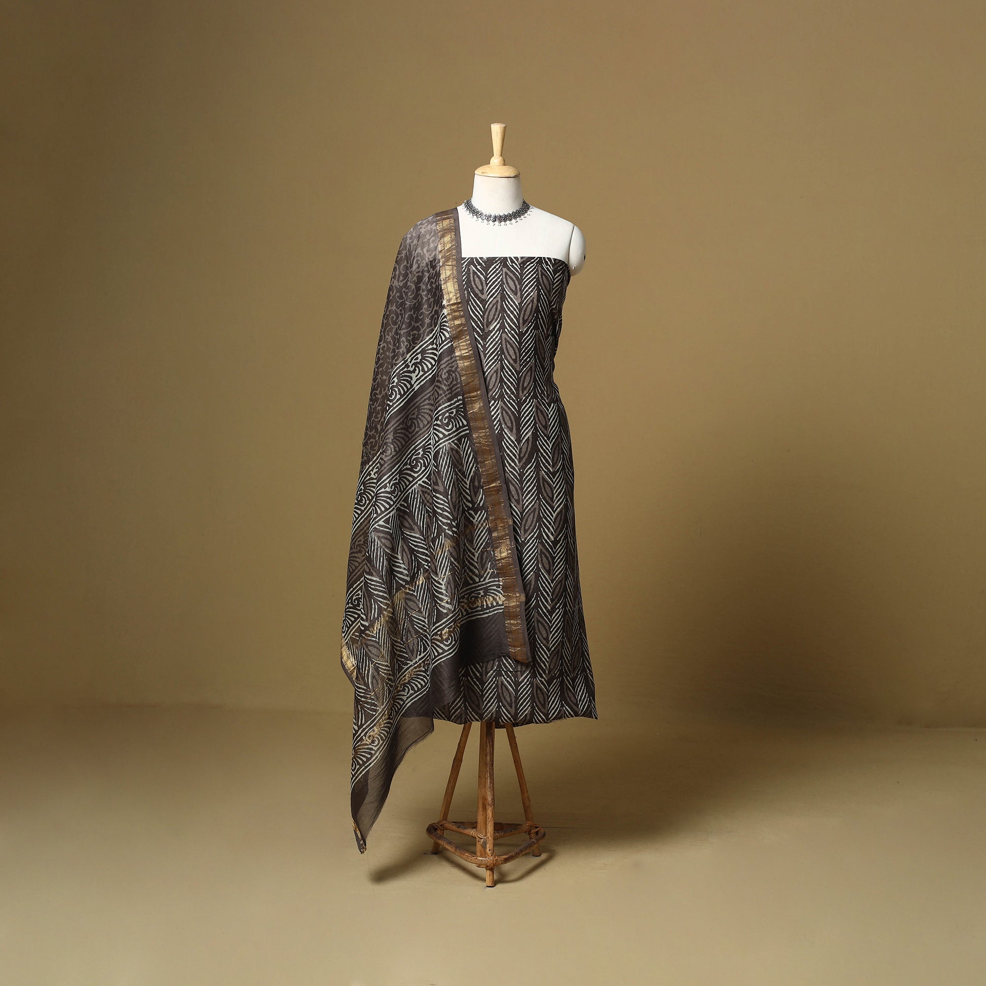 Brown 3pc bagru dress material with zari border crafted from maheshwari silk-cotton fabric. It includes a kurta, a matching dupatta, and a cotton bottom. Each piece is created using the age-old hand block printing technique from Rajasthan, where artisans use hand-carved wooden blocks dipped in natural dyes to imprint bold, earthy patterns, perfect for both special occasions and everyday elegance.