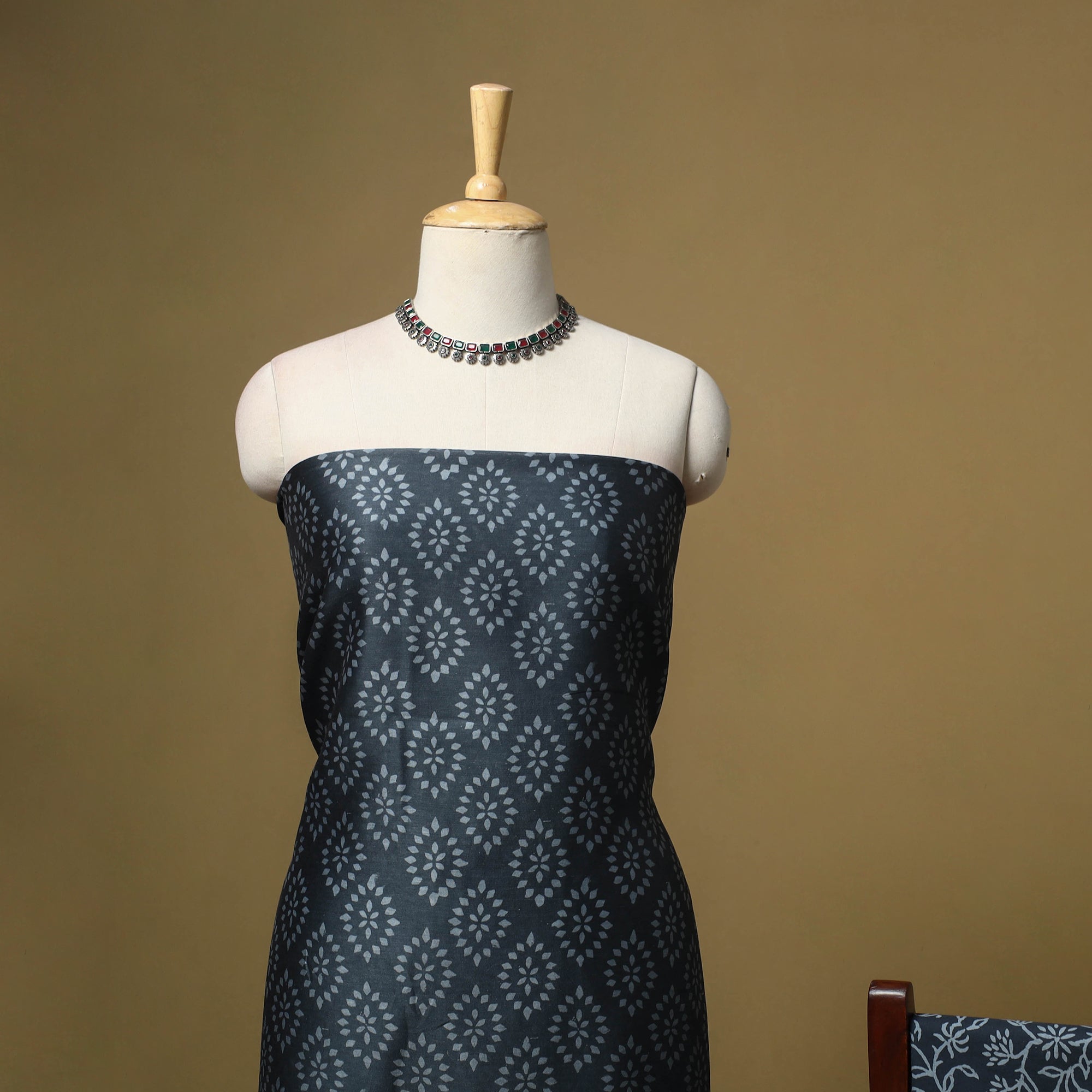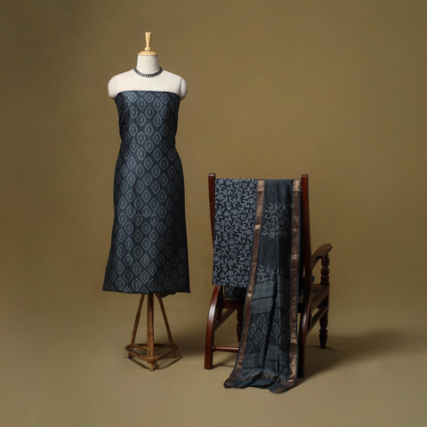 Bagru hand block print natural dyed maheshwari silk-cotton 3pc unstitched dress material with zari border, using the traditional bagru hand block printing technique practiced by skilled artisans of Bagru, Rajasthan for over 400–450 years. The fabric is created by applying a hand-prepared mud resist with carved wooden blocks. After dyeing, the resist is washed away to reveal distinct patterns. The set includes kurta fabric, matching dupatta and a cotton bottom, which can be easily tailored into your preferred style.