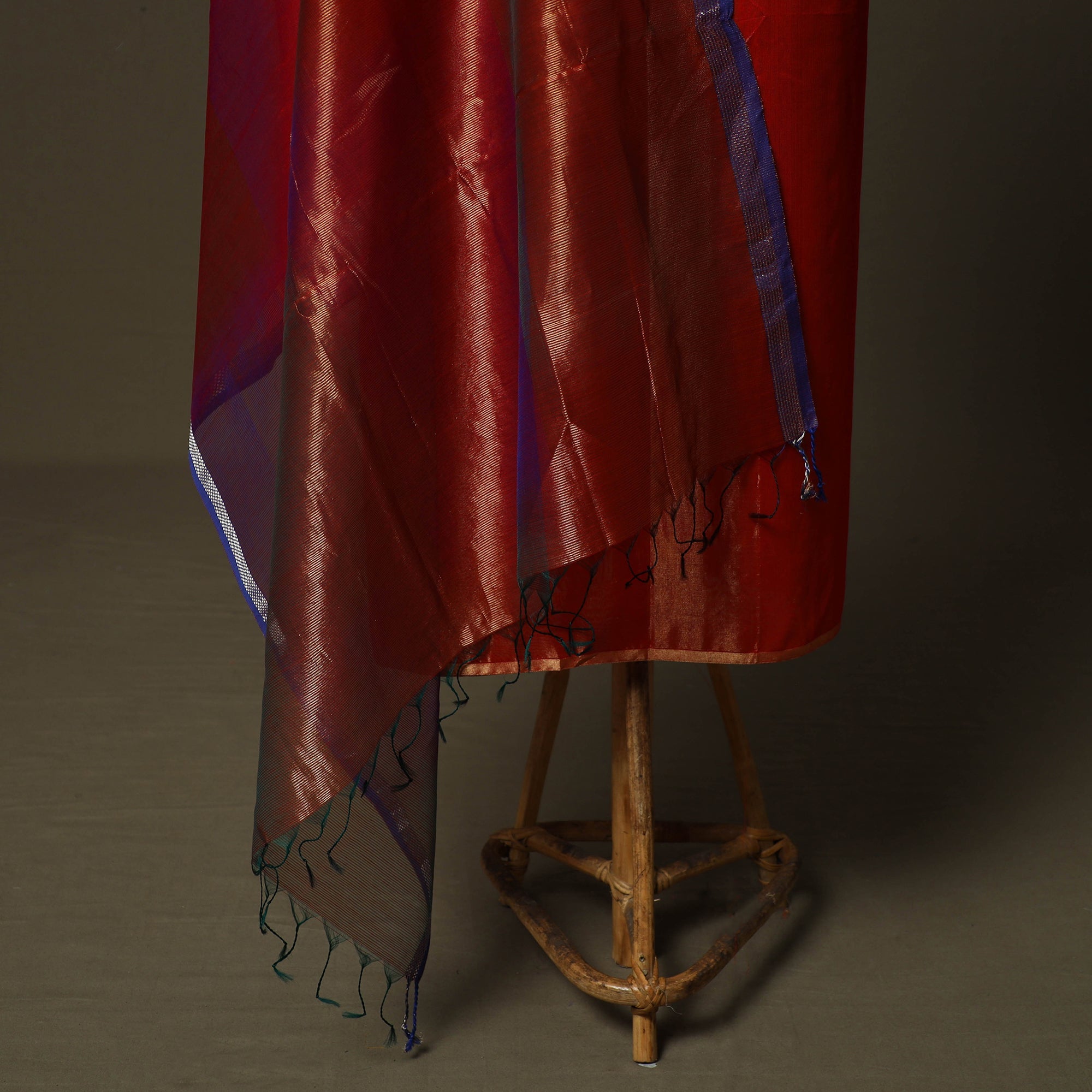 Maheshwari silk full tissue zari handloom 2pc unstitched dress material is crafted by artisan Vikram in Maheshwar, Madhya Pradesh, using traditional weaving techniques. It uses 2/20 organza silk in the warp and 2/120 mercerised cotton and zari in the weft, which gives the set a comfortable feel and a light sheen. This set includes kurta fabric and dupatta. The dupatta is finished with tassels and zari border. It is suitable for weddings, festive events and cultural celebrations.