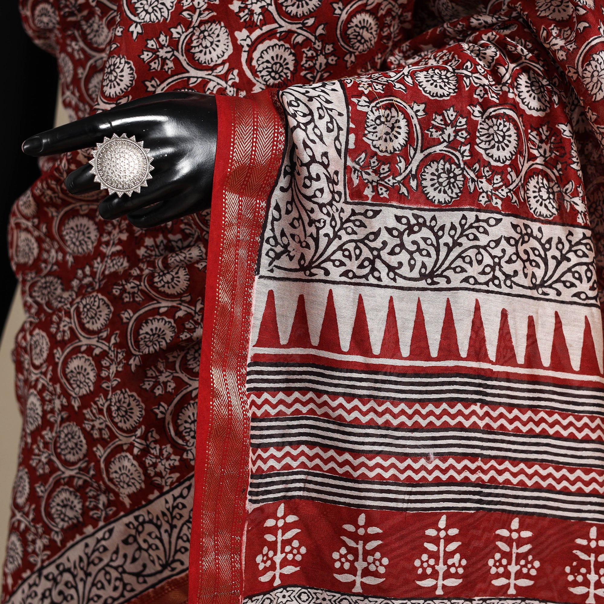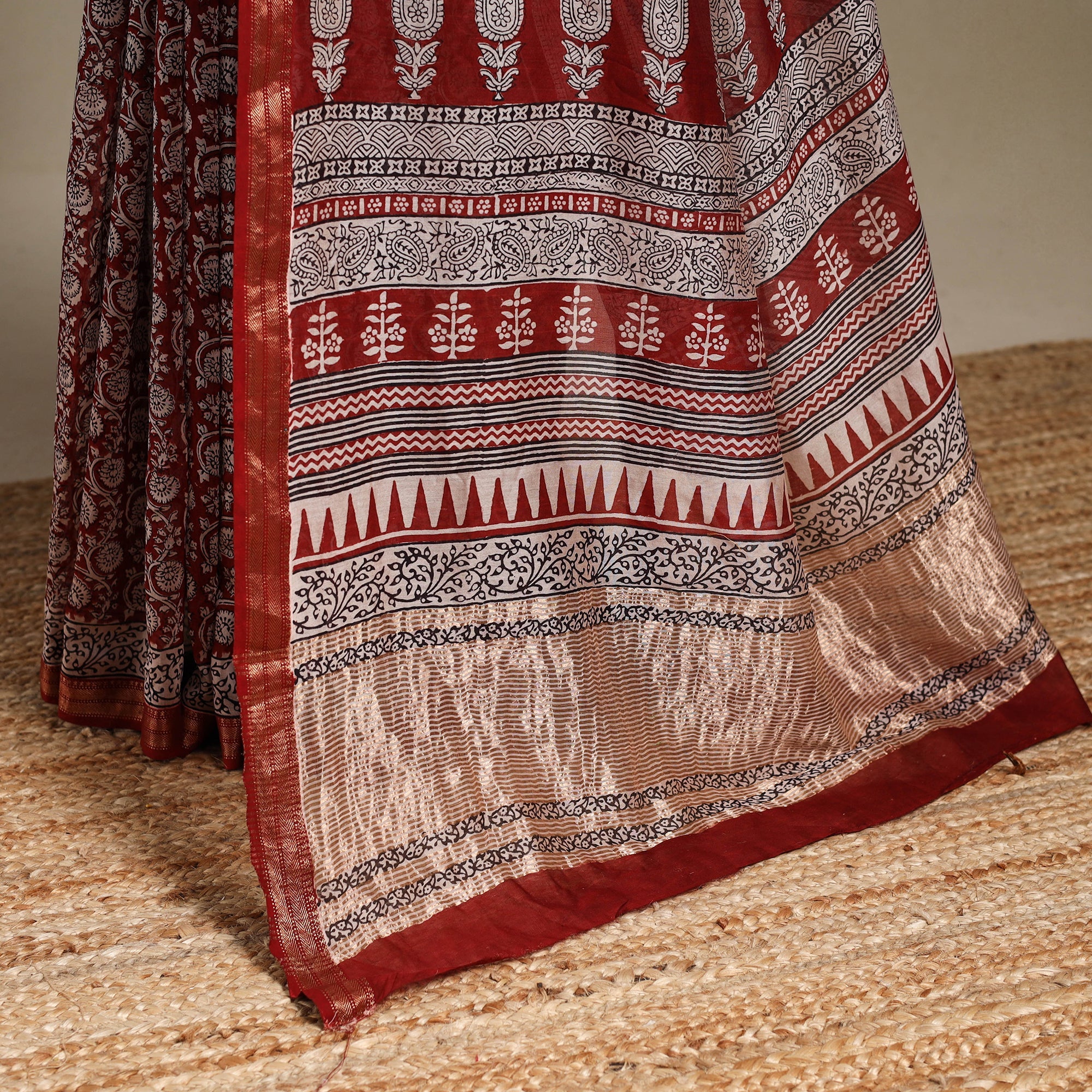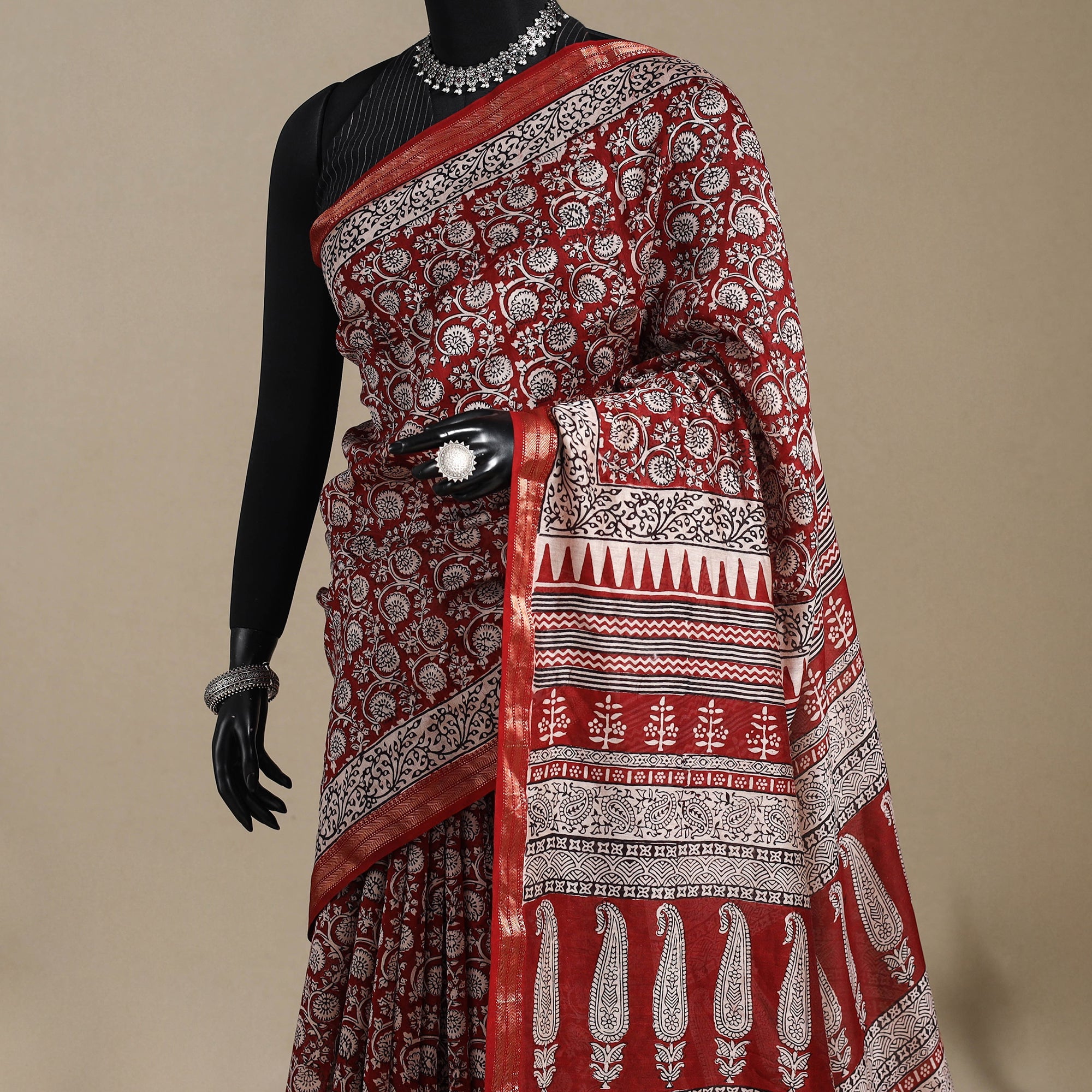 • Red - Maheshwari Silk Natural Dyed Bagh Print Saree with Zari Border 02