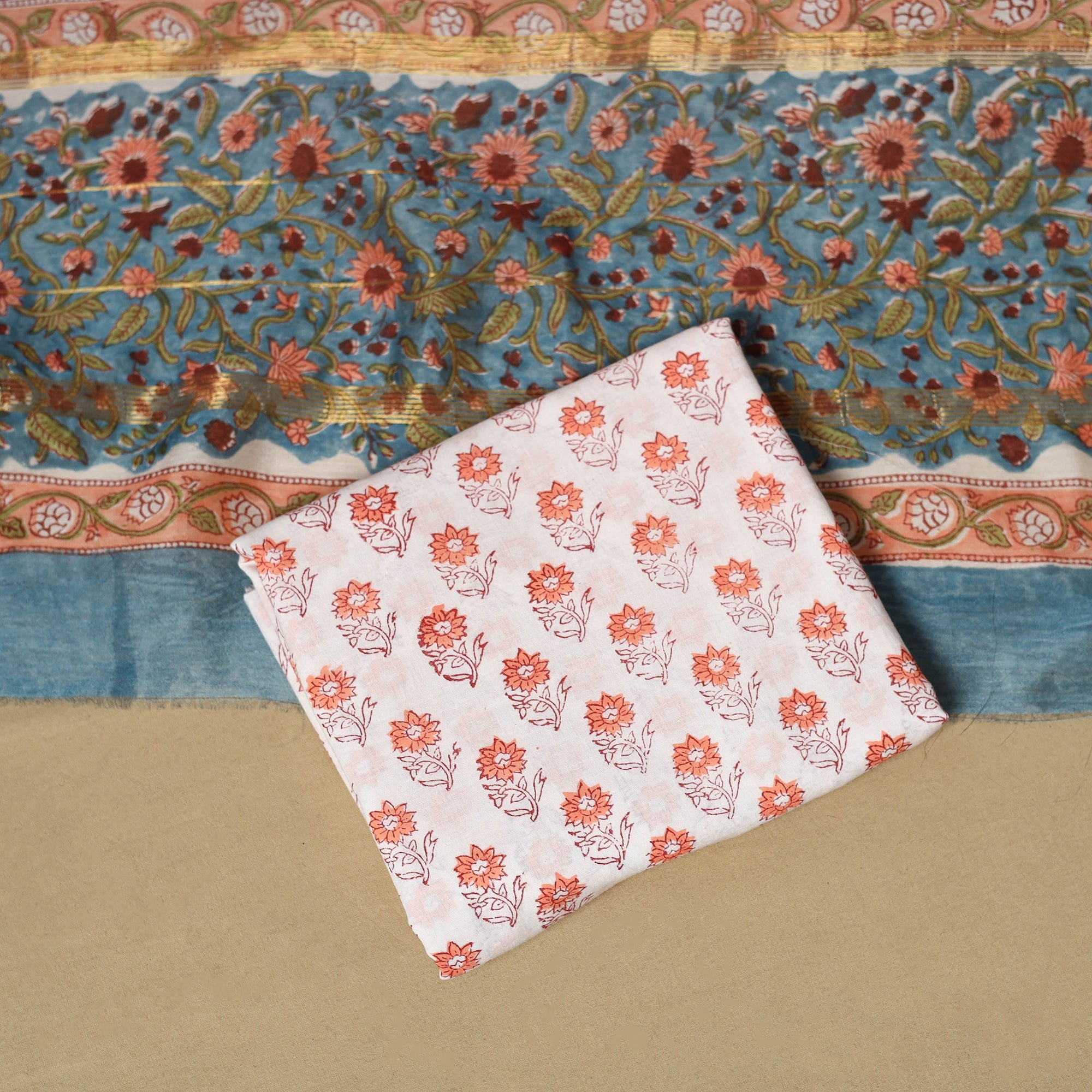 Blue 3pc sanganeri print dress material with zari border is crafted from maheshwari silk-cotton fabric and includes a kurta, a matching dupatta, and a cotton bottom. Adorned with fine floral motifs from Rajasthan, each piece is created using the traditional hand block printing technique, where artisans use hand-carved wooden blocks dipped in azo free vat dyes to imprint intricate designs, perfect for both festive occasions and everyday elegance.