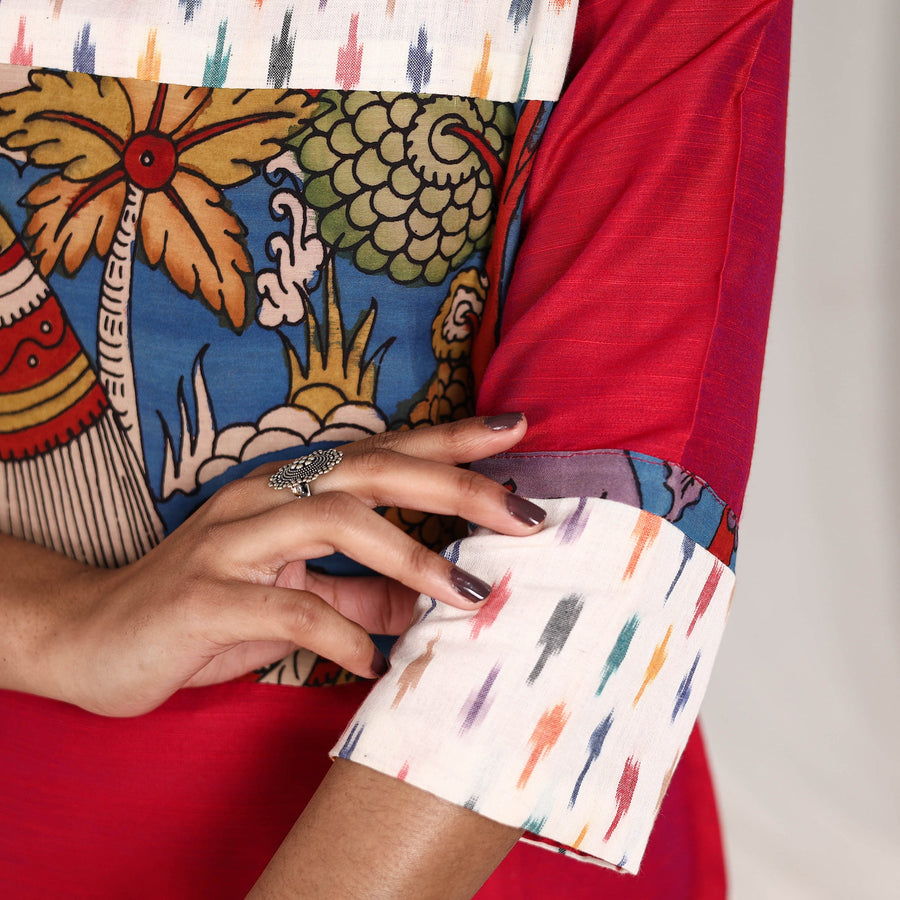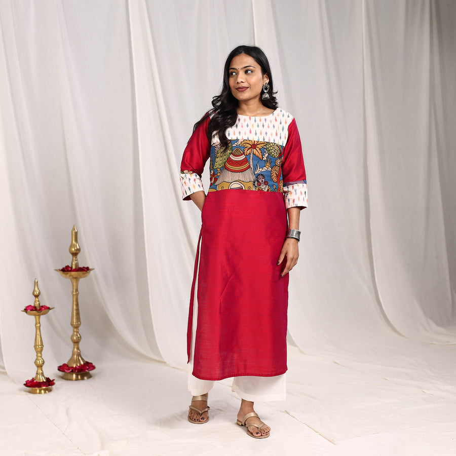 Embrace tradition with the red slub silk straight plain kurta with patchwork, featuring intricate kalamkari and Ikat patchwork. Crafted from slub silk, it offers comfort and style. With a handy one-side pocket, this kurta is perfect for both casual and festive occasions, adding a touch of elegance to your wardrobe.