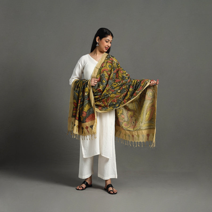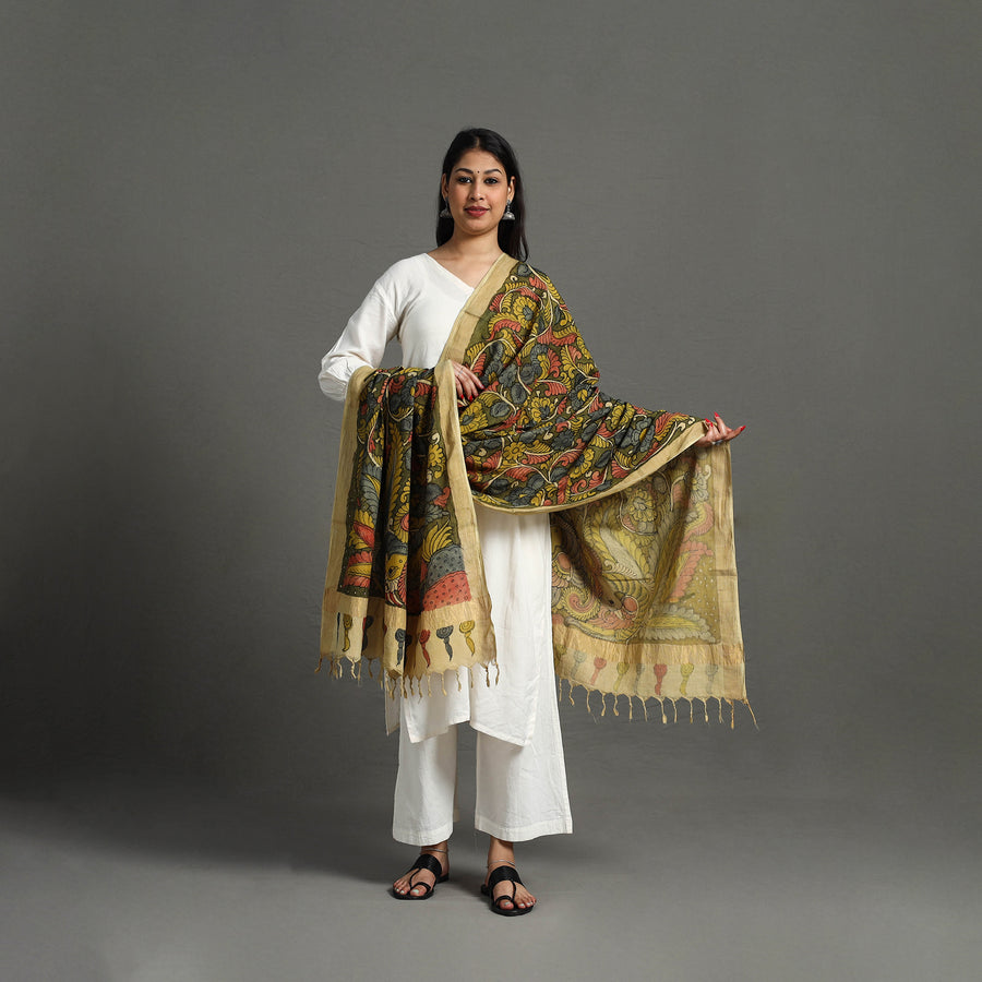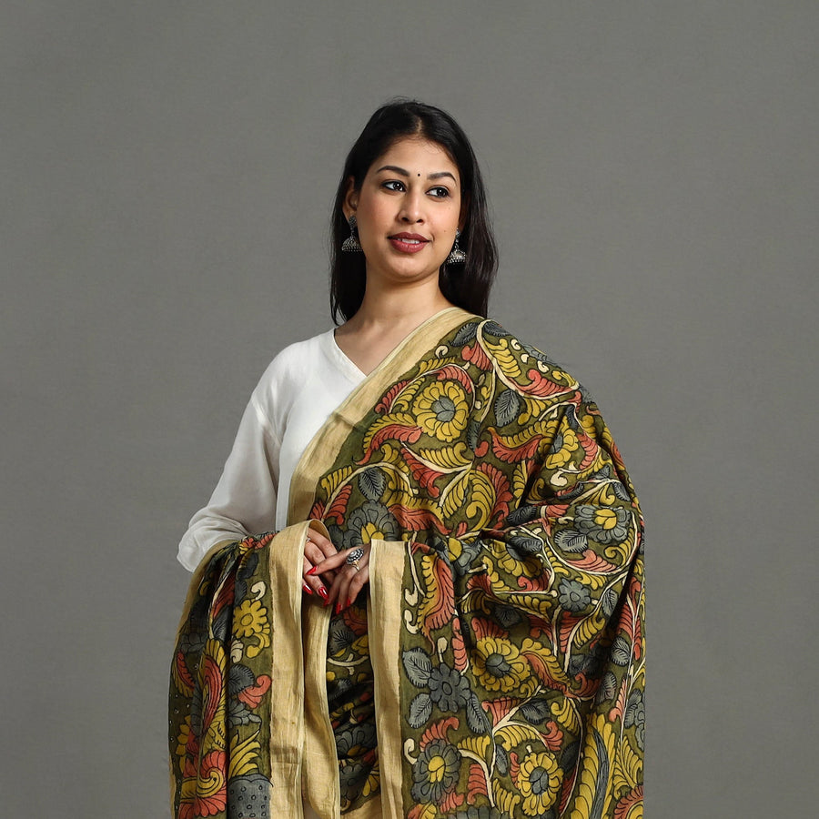 Pen Work green Kalamkari Dupatta, an artfully handpainted mangalgiri cotton piece made with natural dyes. This exquisite handloom zari dupatta is created in the srikalahasti style of kalamkari, wherein the "kalam" or pen is used for free-hand drawing of the subject and filling in the colors. It is entirely handcrafted using natural colors. Kalamkari in Srikalahasti has been around for approximately 200 years. Unlike other places where this particular craft is practiced, artists in srikalahasti retain the ancient techniques of dyeing that have been passed down through generations. As it is hand-painted or handcrafted, color spread and irregularities in design are common; hence, it won't be considered damaged or defective. Each dupatta carries unique patterns, adding a cultural touch to your wardrobe.