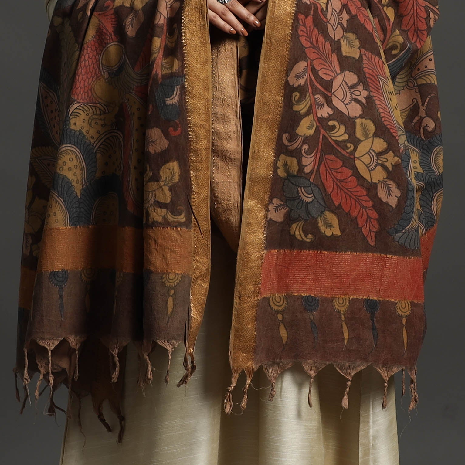 This handloom brown mangalagiri cotton handpainted pen work kalamkari nizam zari border dupatta is created in the srikalahasti style of kalamkari, wherein the "kalam" or pen is used for free-hand drawing of the subject and filling in the colors. As it is hand-painted or handcrafted, color spread and irregularities in design are common. Each dupatta carries unique patterns, adding a cultural touch to your wardrobe.