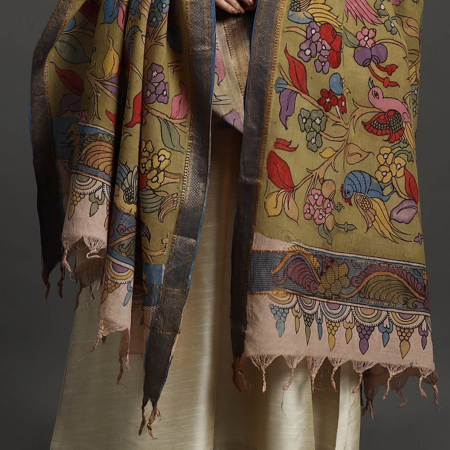 Step into the world of heritage crafts with this green srikalahasti handpainted mangalagiri cotton pen work kalamkari dupatta. Made from handloom cotton and handpainted using traditional kalam (pen), this dupatta showcases the legacy of 200 year old artistry. Artisans of Srikalahasti continue the ancient techniques of natural dyeing and freehand painting. Adorned with a zari border and tassels, this exquisite dupatta making it a sophisticated addition to your wardrobe.