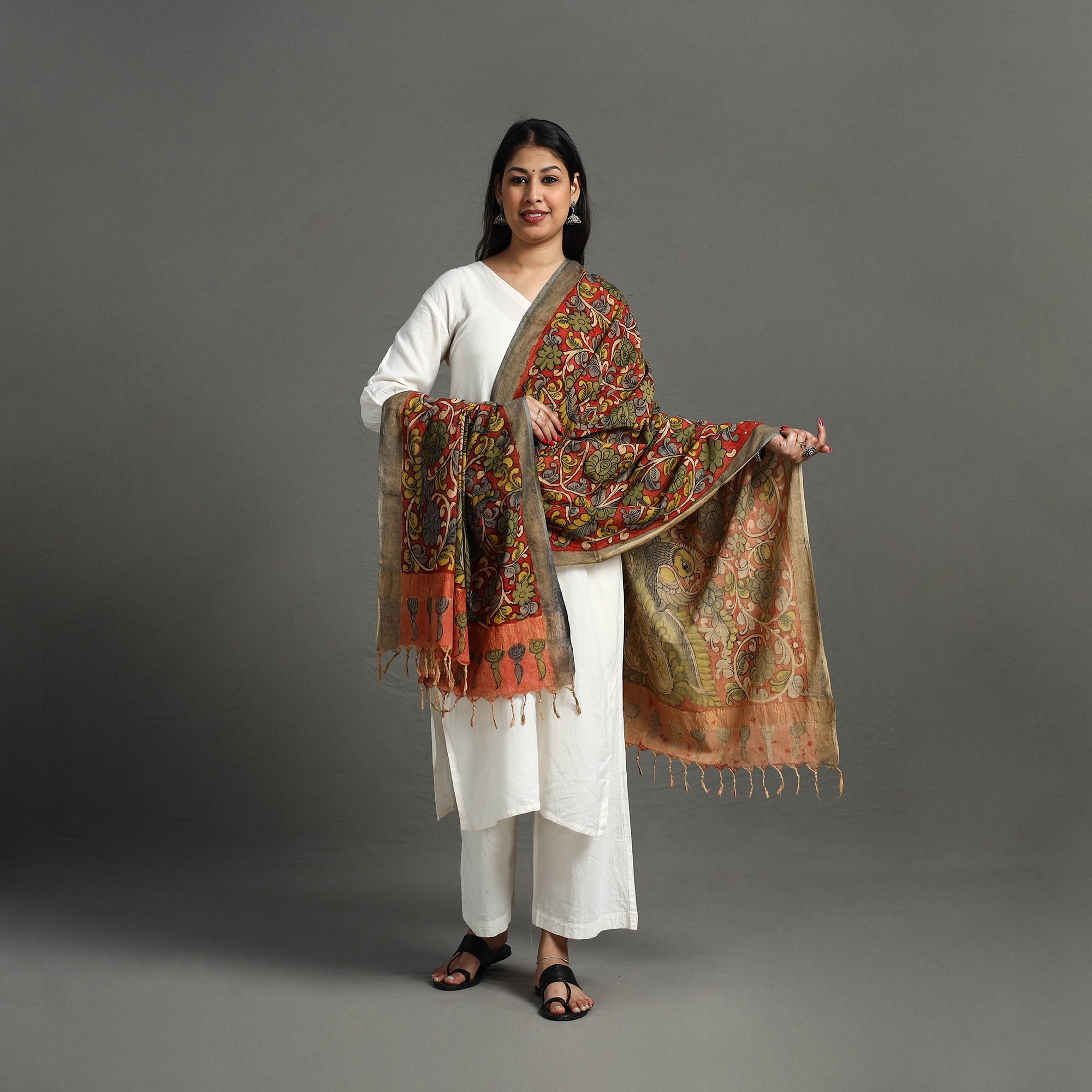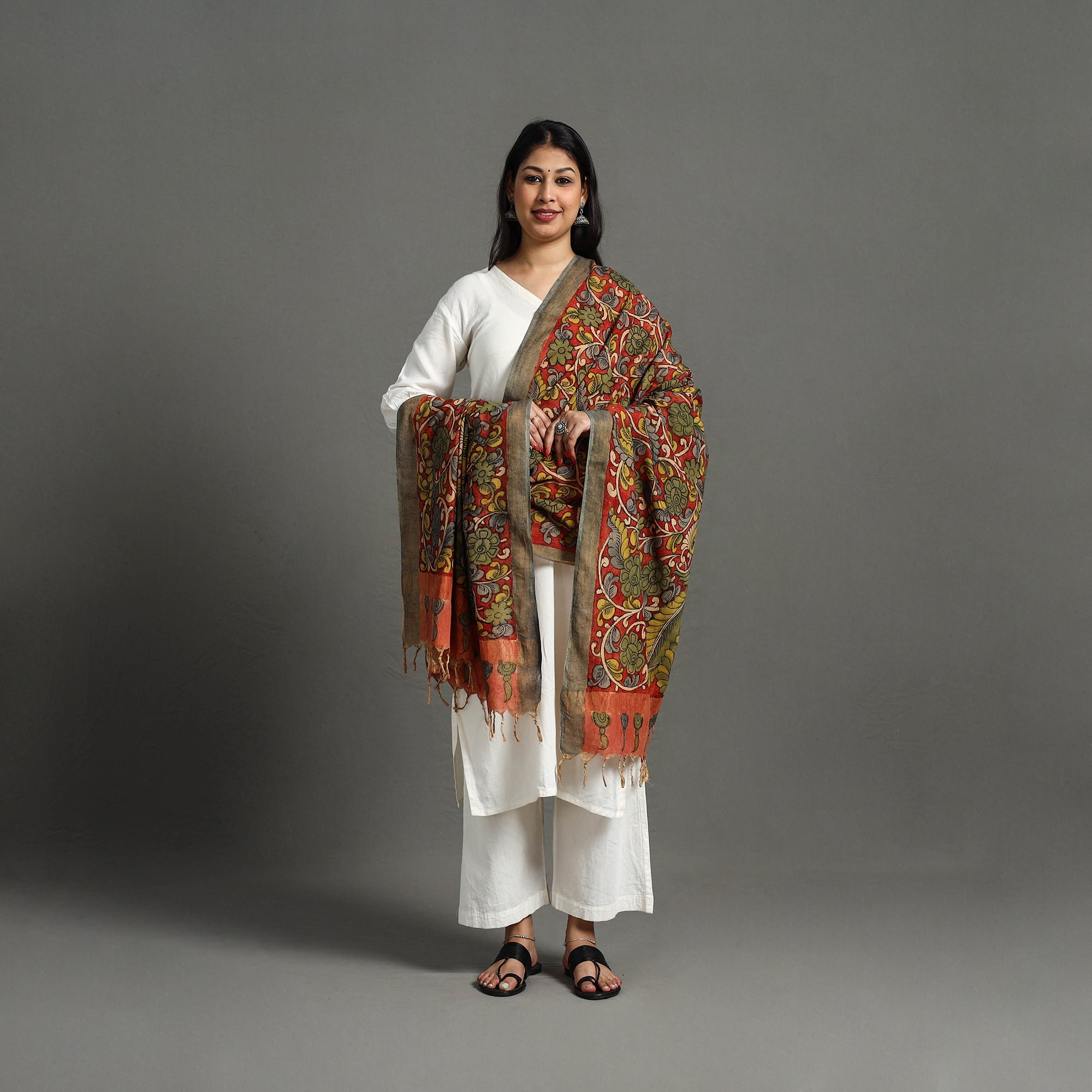 Pen Work red Kalamkari Dupatta, an artfully handpainted mangalgiri cotton piece made with natural dyes. This exquisite handloom zari dupatta is created in the srikalahasti style of kalamkari, wherein the "kalam" or pen is used for free-hand drawing of the subject and filling in the colors. It is entirely handcrafted using natural colors. Kalamkari in Srikalahasti has been around for approximately 200 years. Unlike other places where this particular craft is practiced, artists in srikalahasti retain the ancient techniques of dyeing that have been passed down through generations. As it is hand-painted or handcrafted, color spread and irregularities in design are common; hence, it won't be considered damaged or defective. Each dupatta carries unique patterns, adding a cultural touch to your wardrobe.