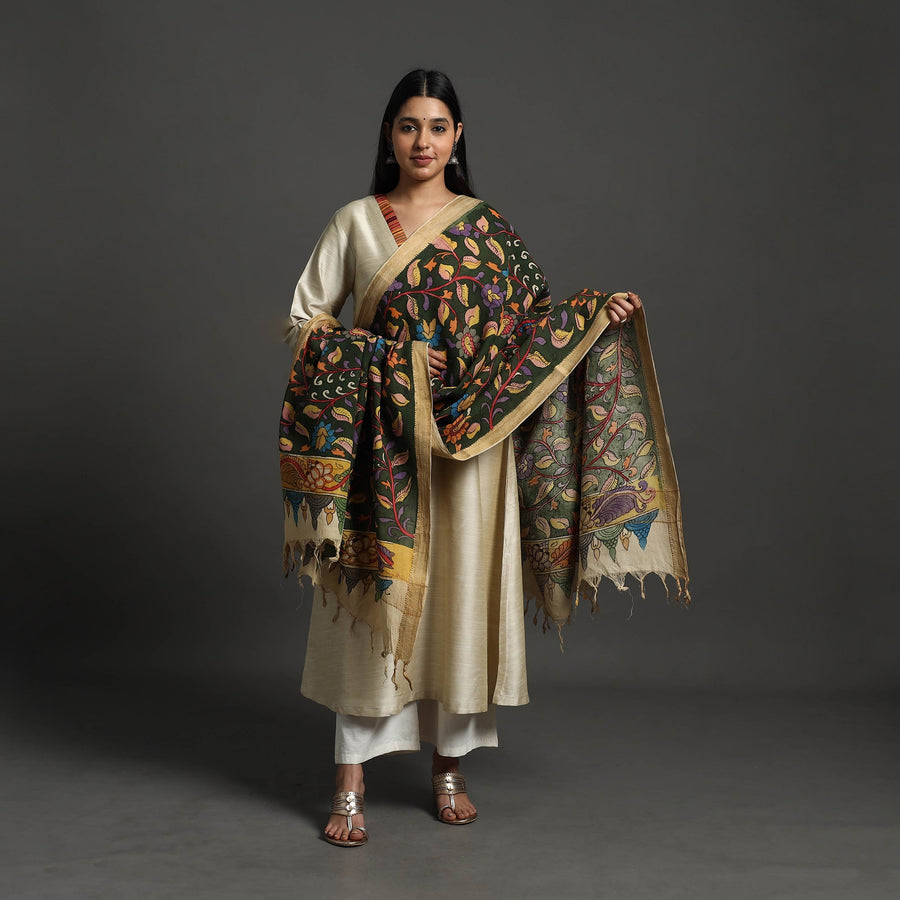 Step into the world of heritage crafts with this srikalahasti handpainted mangalagiri cotton pen work kalamkari dupatta. Made from handloom cotton and handpainted using traditional kalam (pen), this dupatta showcases the legacy of 200 year old artistry. Artisans of Srikalahasti continue the ancient techniques of natural dyeing and freehand painting. Adorned with a zari border and tassels, this exquisite dupatta making it a sophisticated addition to your wardrobe.