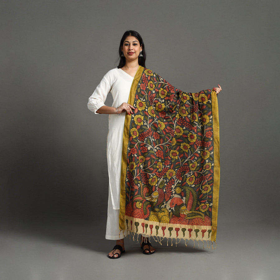Pen Work Kalamkari Dupatta, an artfully grey handpainted mangalgiri cotton piece made with natural dyes. This exquisite handloom zari dupatta is created in the srikalahasti style of kalamkari, wherein the "kalam" or pen is used for free-hand drawing of the subject and filling in the colors. It is entirely handcrafted using natural colors. Kalamkari in Srikalahasti has been around for approximately 200 years. Unlike other places where this particular craft is practiced, artists in srikalahasti retain the ancient techniques of dyeing that have been passed down through generations. As it is hand-painted or handcrafted, color spread and irregularities in design are common; hence, it won't be considered damaged or defective. Each dupatta carries unique patterns, adding a cultural touch to your wardrobe.
