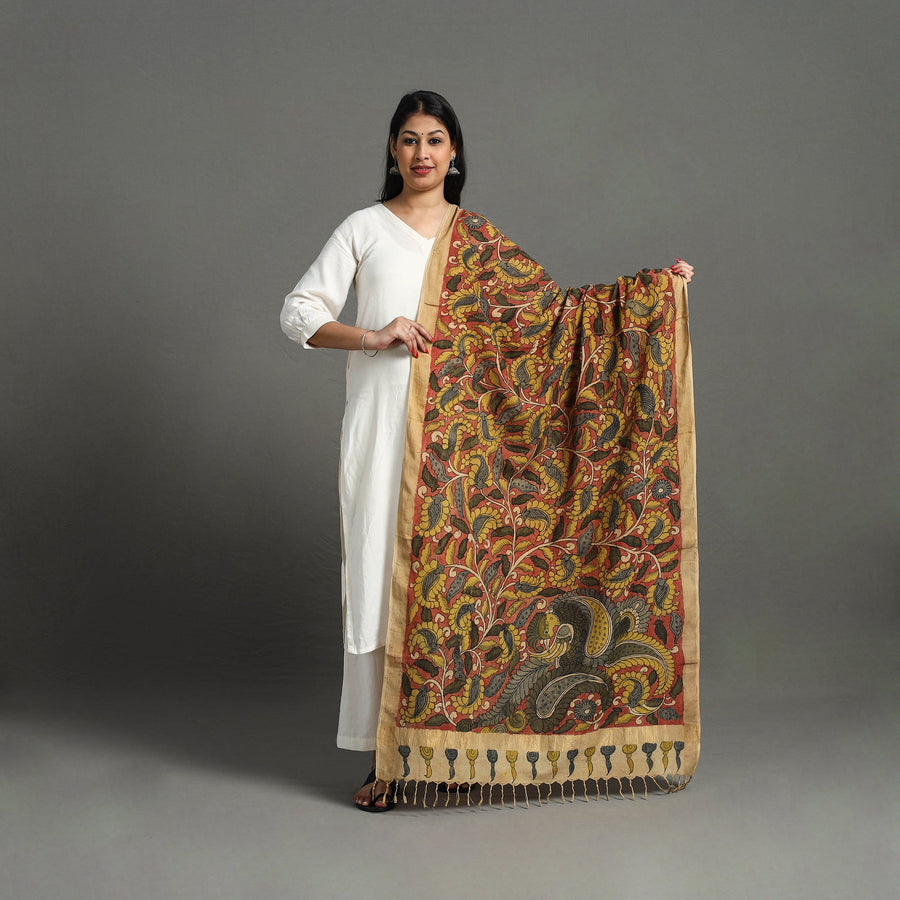 Pen Work Red Kalamkari Dupatta, an artfully handpainted mangalgiri cotton piece made with natural dyes. This exquisite handloom zari dupatta is created in the srikalahasti style of kalamkari, wherein the "kalam" or pen is used for free-hand drawing of the subject and filling in the colors. It is entirely handcrafted using natural colors. Kalamkari in Srikalahasti has been around for approximately 200 years. Unlike other places where this particular craft is practiced, artists in srikalahasti retain the ancient techniques of dyeing that have been passed down through generations. As it is hand-painted or handcrafted, color spread and irregularities in design are common; hence, it won't be considered damaged or defective. Each dupatta carries unique patterns, adding a cultural touch to your wardrobe.