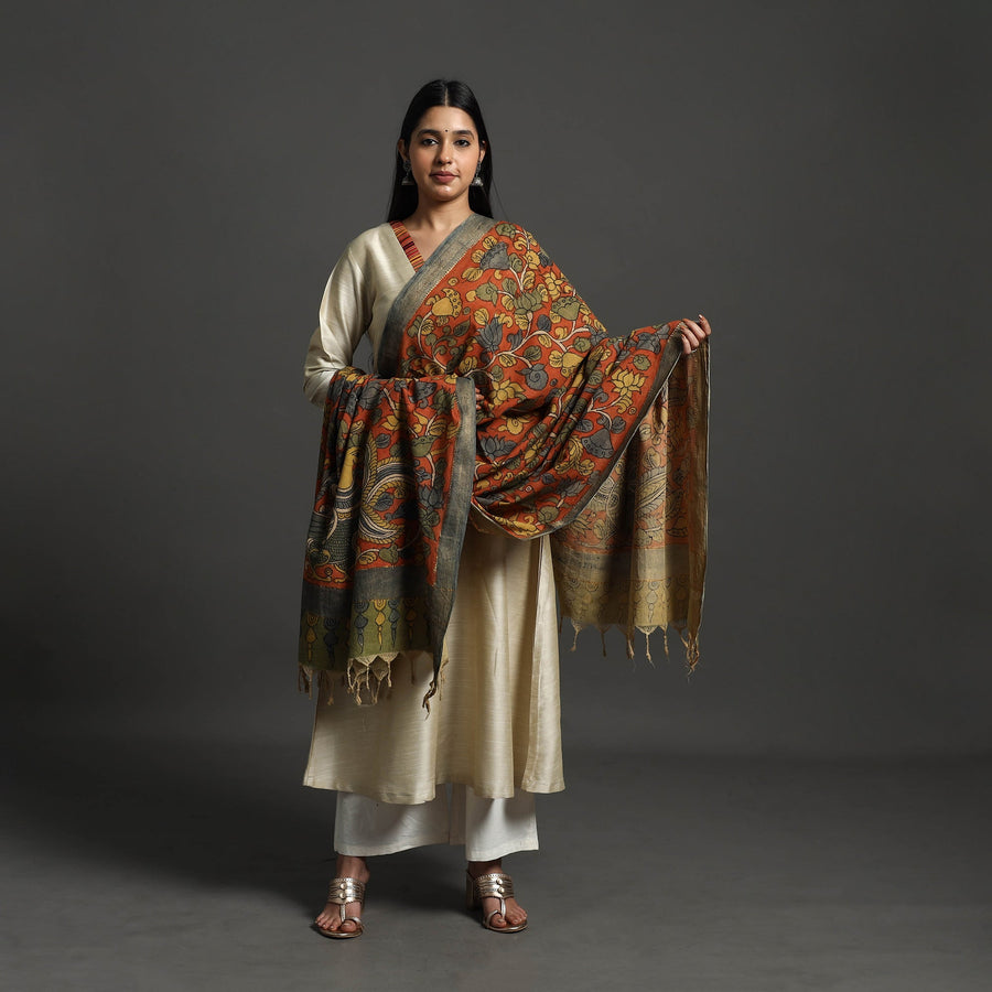 This handloom orange mangalagiri cotton handpainted pen work kalamkari nizam zari border dupatta is created in the srikalahasti style of kalamkari, wherein the "kalam" or pen is used for free-hand drawing of the subject and filling in the colors. As it is hand-painted or handcrafted, color spread and irregularities in design are common. Each dupatta carries unique patterns, adding a cultural touch to your wardrobe.