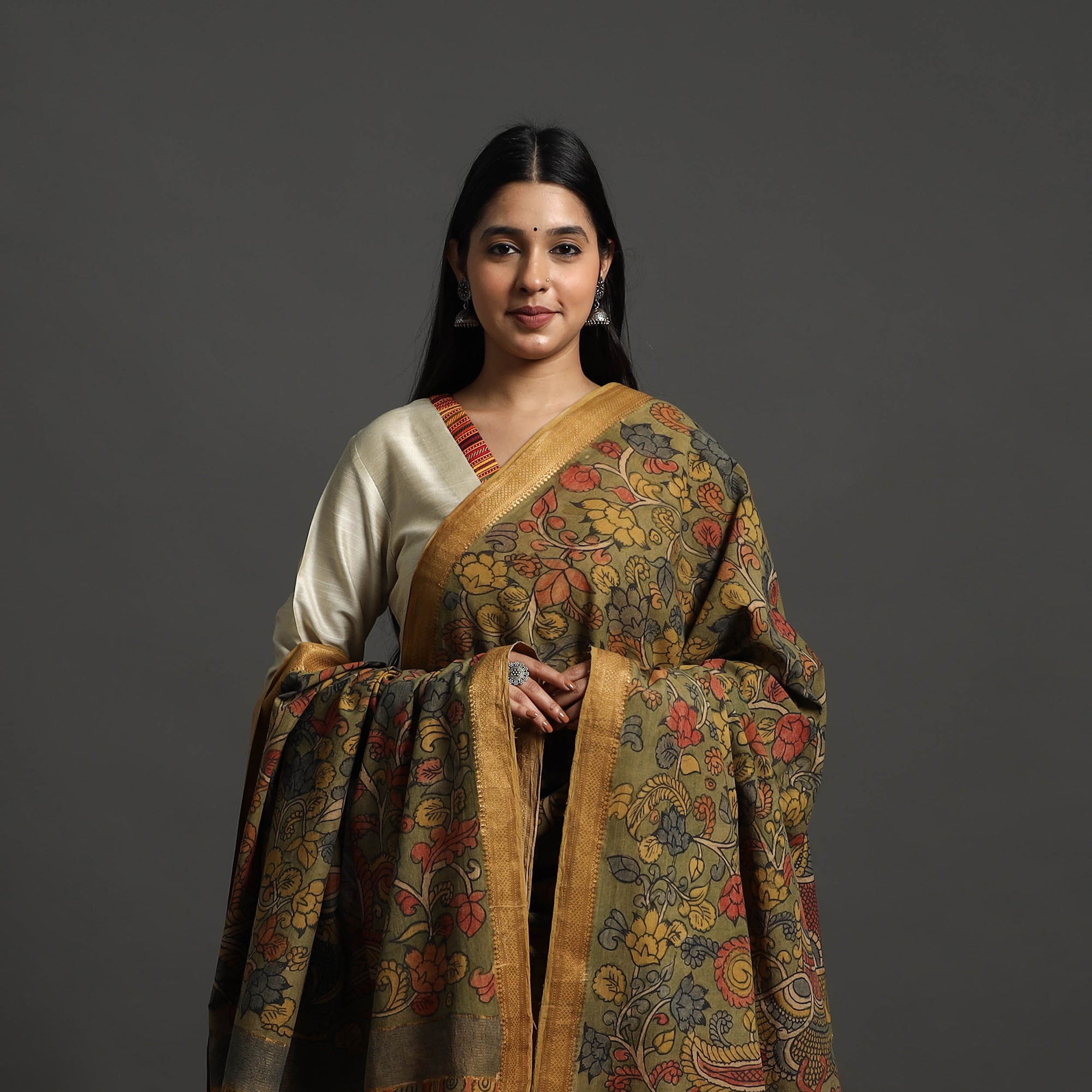 This handloom green mangalagiri cotton handpainted pen work kalamkari nizam zari border dupatta is created in the srikalahasti style of kalamkari, wherein the "kalam" or pen is used for free-hand drawing of the subject and filling in the colors. As it is hand-painted or handcrafted, color spread and irregularities in design are common. Each dupatta carries unique patterns, adding a cultural touch to your wardrobe.