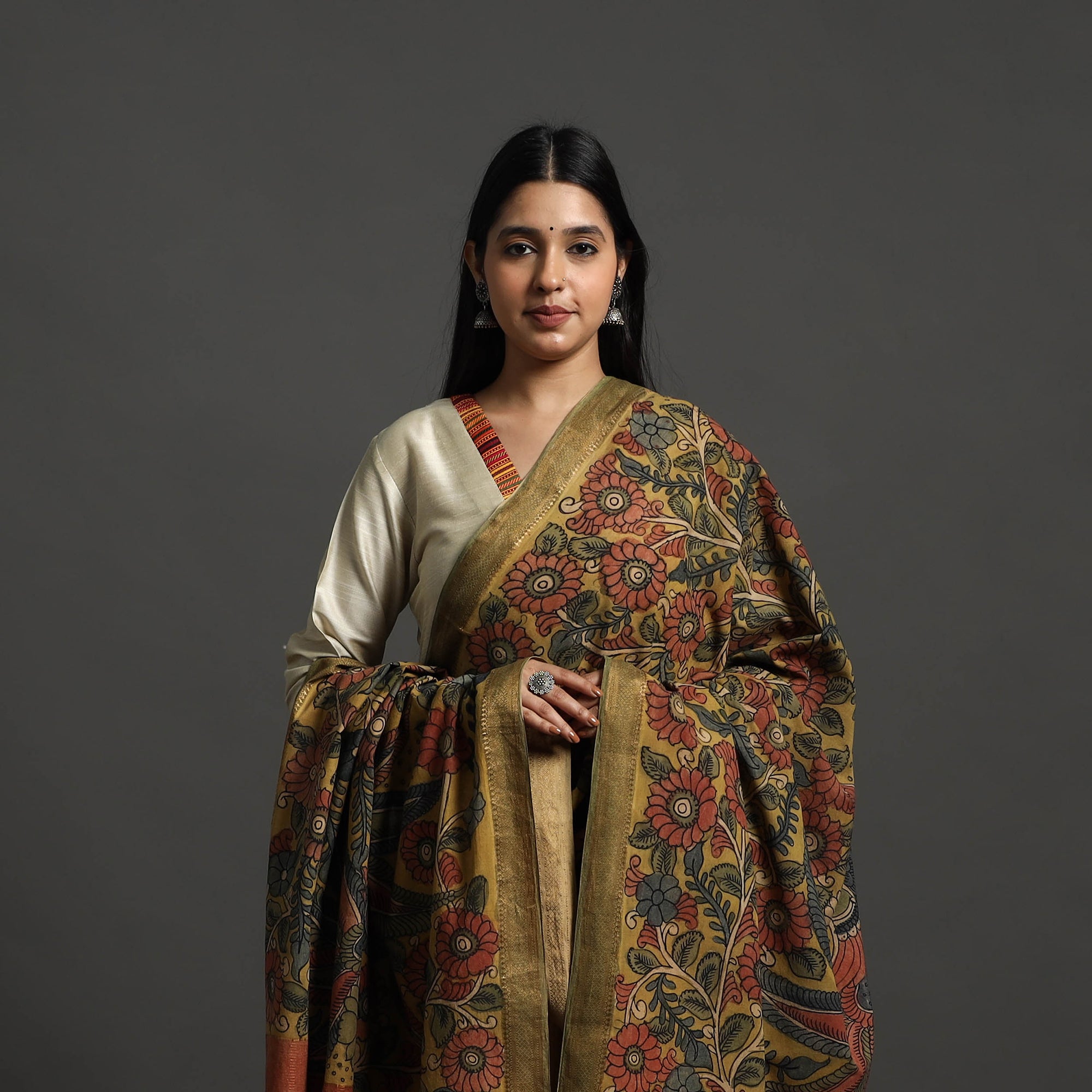 This handloom yellow mangalagiri cotton handpainted pen work kalamkari nizam zari border dupatta is created in the srikalahasti style of kalamkari, wherein the "kalam" or pen is used for free-hand drawing of the subject and filling in the colors. As it is hand-painted or handcrafted, color spread and irregularities in design are common. Each dupatta carries unique patterns, adding a cultural touch to your wardrobe.