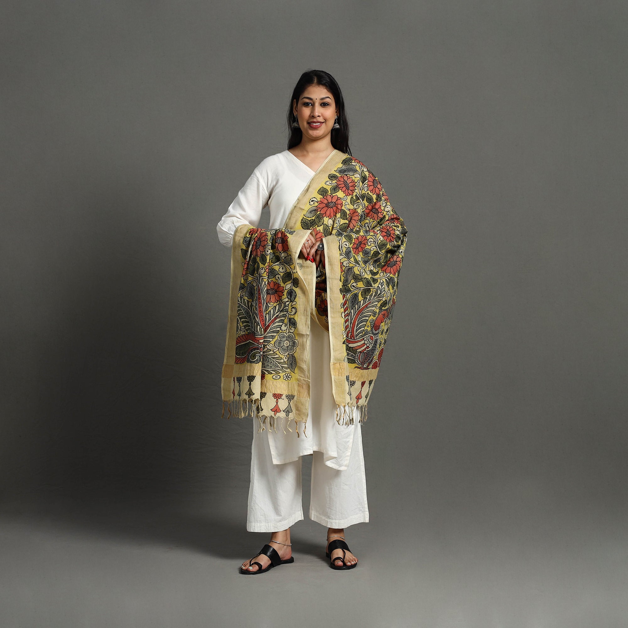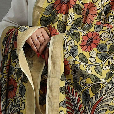 Pen work yellow kalamkari dupatta, an artfully handpainted mangalgiri cotton piece made with natural dyes. This exquisite handloom zari dupatta is created in the srikalahasti style of kalamkari, wherein the "kalam" or pen is used for free-hand drawing of the subject and filling in the colors. It is entirely handcrafted using natural colors. Kalamkari in Srikalahasti has been around for approximately 200 years. Unlike other places where this particular craft is practiced, artists in srikalahasti retain the ancient techniques of dyeing that have been passed down through generations. As it is hand-painted or handcrafted, color spread and irregularities in design are common; hence, it won't be considered damaged or defective. Each dupatta carries unique patterns, adding a cultural touch to your wardrobe.