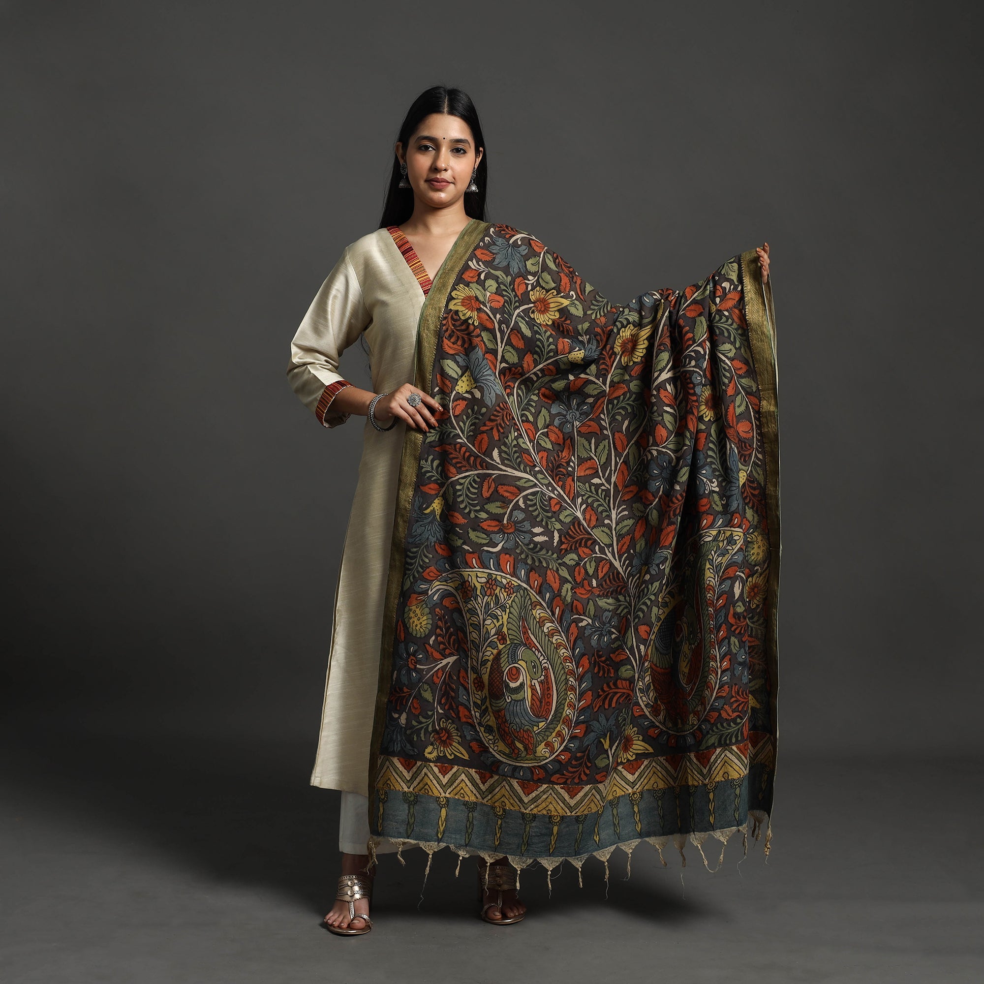 This handloom grey mangalagiri cotton handpainted pen work kalamkari nizam zari border dupatta is created in the srikalahasti style of kalamkari, wherein the "kalam" or pen is used for free-hand drawing of the subject and filling in the colors. As it is hand-painted or handcrafted, color spread and irregularities in design are common. Each dupatta carries unique patterns, adding a cultural touch to your wardrobe.