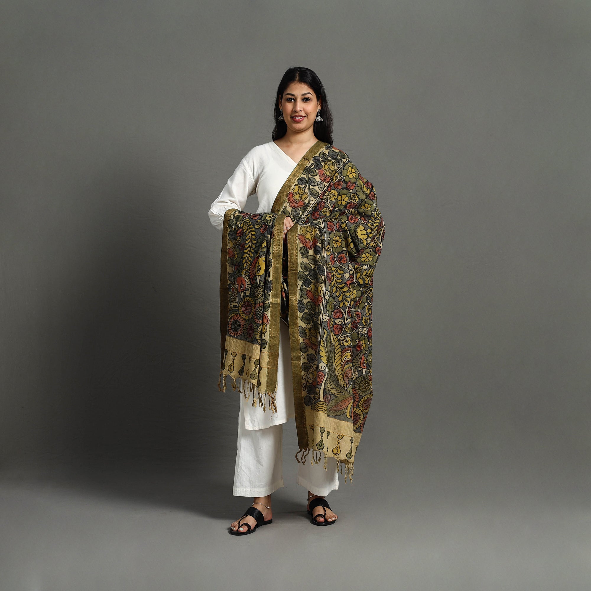 Pen work grey kalamkari dupatta, an artfully handpainted mangalgiri cotton piece made with natural dyes. This exquisite handloom nizam zari dupatta is created in the srikalahasti style of kalamkari, wherein the "kalam" or pen is used for free-hand drawing of the subject and filling in the colors. It is entirely handcrafted using natural colors. Kalamkari in Srikalahasti has been around for approximately 200 years. Unlike other places where this particular craft is practiced, artists in srikalahasti retain the ancient techniques of dyeing that have been passed down through generations. As it is hand-painted or handcrafted, color spread and irregularities in design are common; hence, it won't be considered damaged or defective. Each dupatta carries unique patterns, adding a cultural touch to your wardrobe.