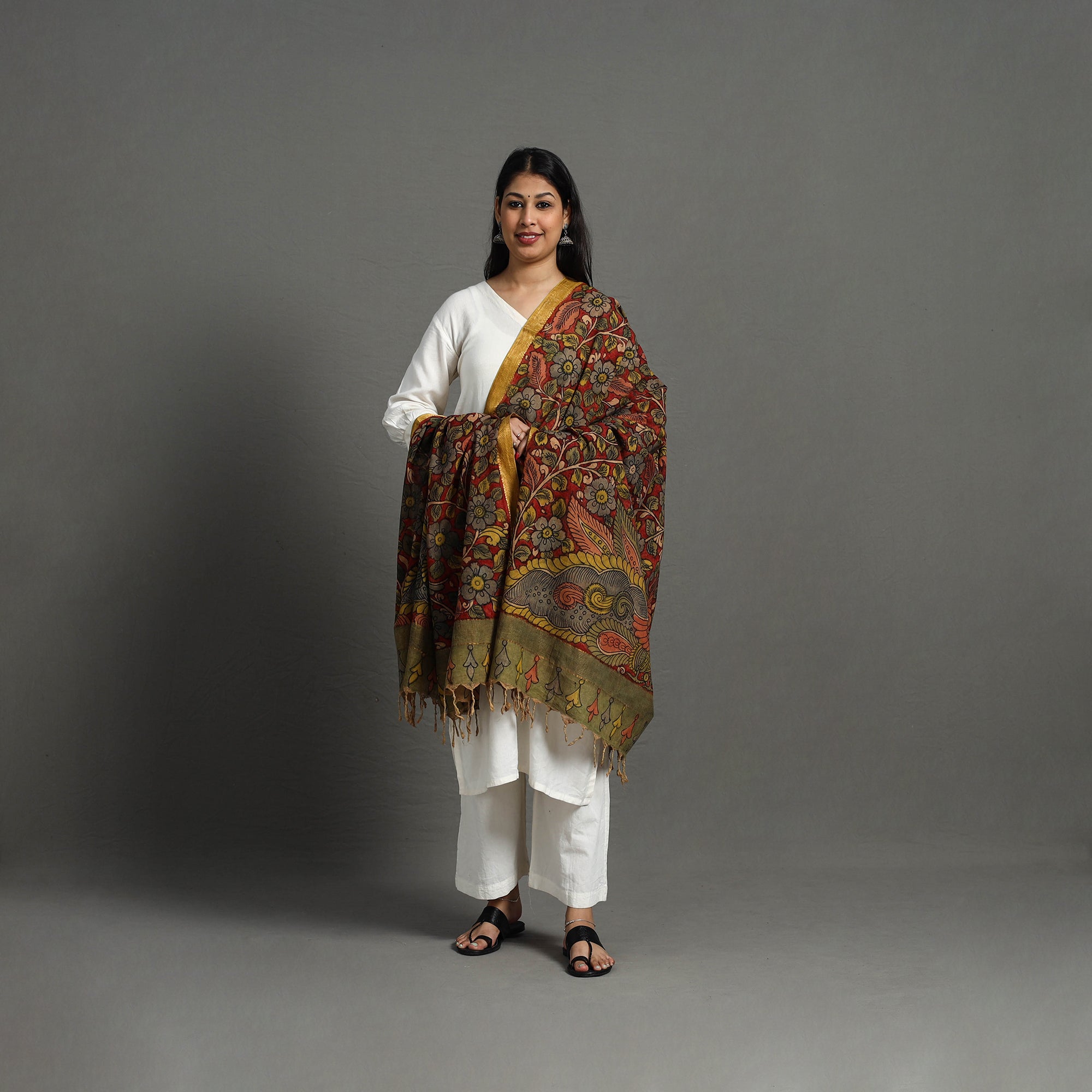 Pen Work red Kalamkari Dupatta, an artfully handpainted mangalgiri cotton piece made with natural dyes. This exquisite handloom nizam zari dupatta is created in the srikalahasti style of kalamkari, wherein the "kalam" or pen is used for free-hand drawing of the subject and filling in the colors. It is entirely handcrafted using natural colors. Kalamkari in Srikalahasti has been around for approximately 200 years. Unlike other places where this particular craft is practiced, artists in srikalahasti retain the ancient techniques of dyeing that have been passed down through generations. As it is hand-painted or handcrafted, color spread and irregularities in design are common; hence, it won't be considered damaged or defective. Each dupatta carries unique patterns, adding a cultural touch to your wardrobe.