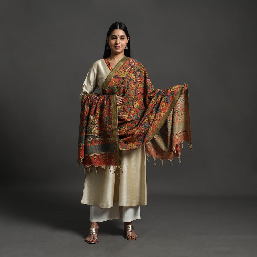 This handloom red mangalagiri cotton handpainted pen work kalamkari nizam zari border dupatta is created in the srikalahasti style of kalamkari, wherein the "kalam" or pen is used for free-hand drawing of the subject and filling in the colors. As it is hand-painted or handcrafted, color spread and irregularities in design are common. Each dupatta carries unique patterns, adding a cultural touch to your wardrobe.