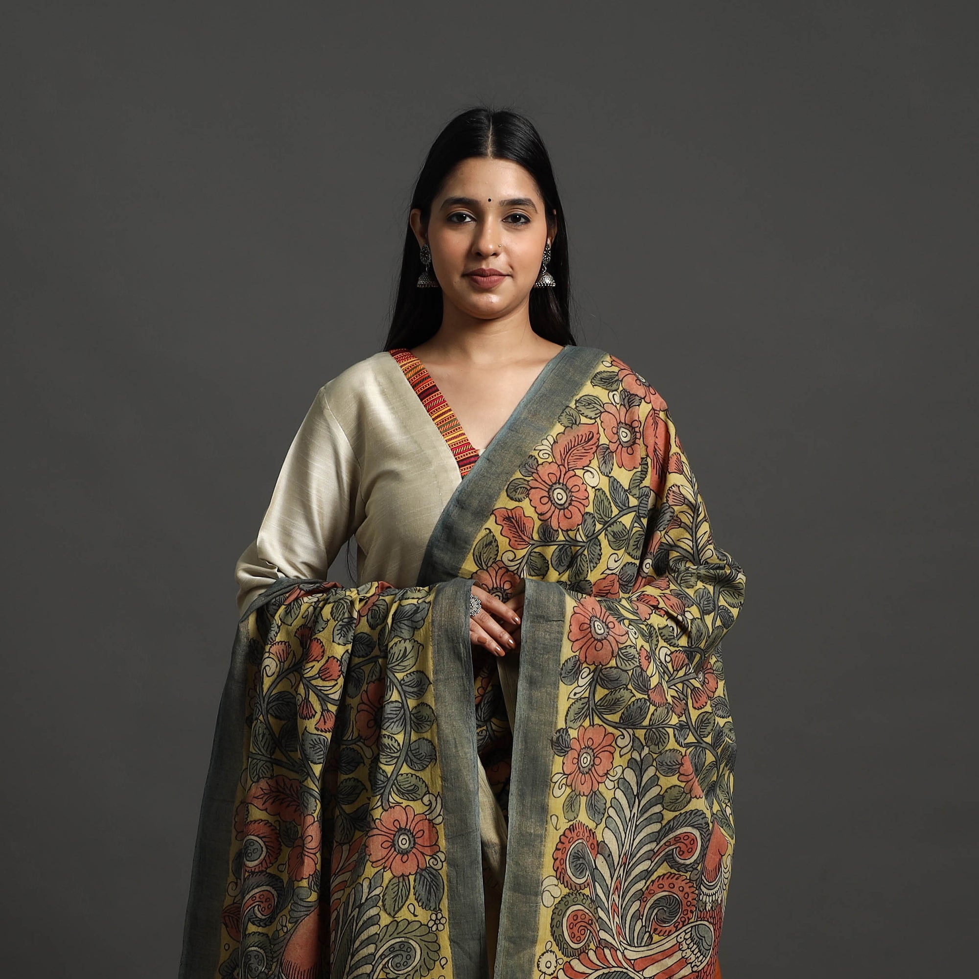 Mangalagiri cotton handpainted pen work yellow kalamkari dupatta. This handloom zari border dupatta is created in the srikalahasti style of kalamkari, wherein the "kalam" or pen is used for free-hand drawing of the subject and filling in the colors. As it is hand-painted or handcrafted, color spread and irregularities in design are common. Each dupatta carries unique patterns, adding a cultural touch to your wardrobe.