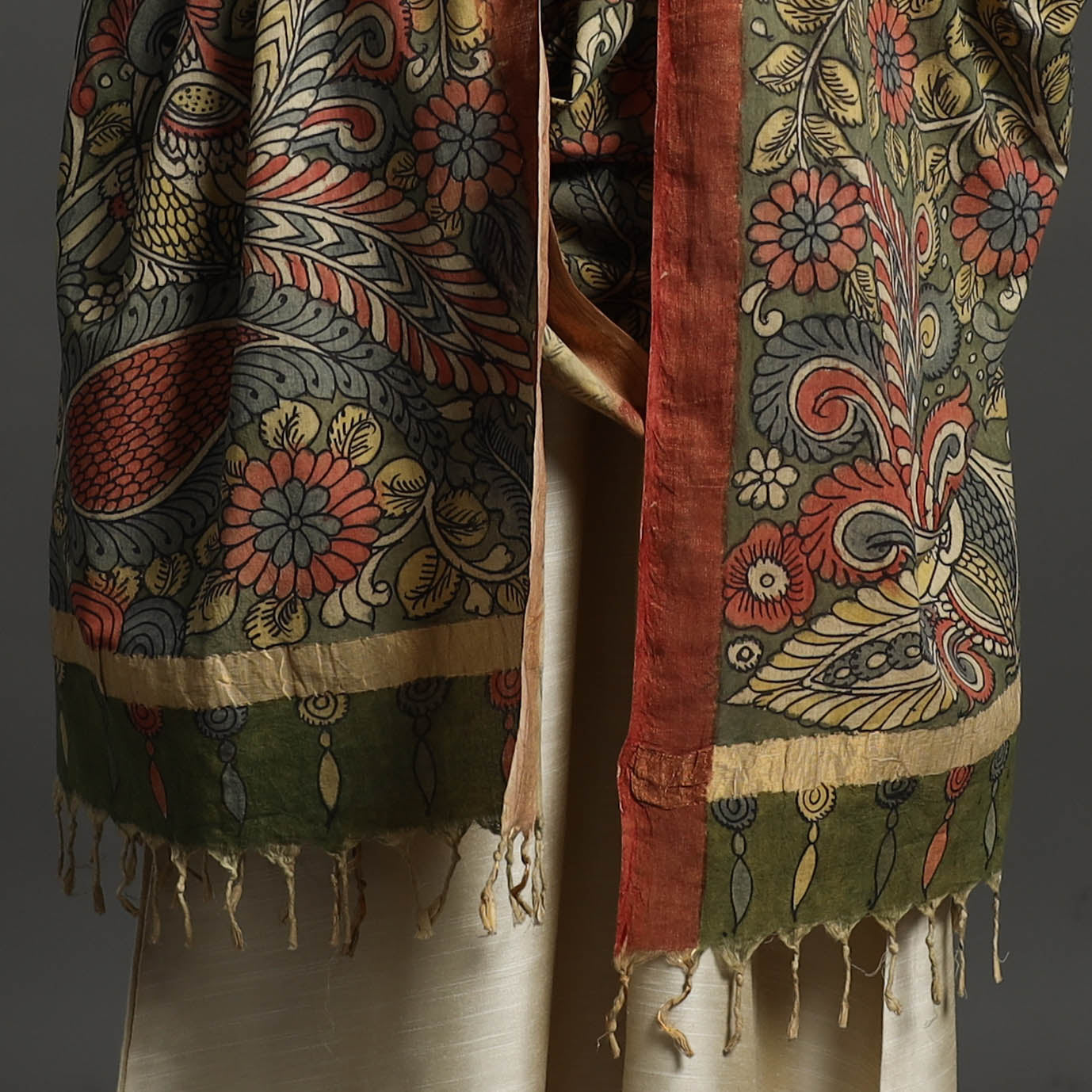 Mangalagiri cotton green handpainted pen work kalamkari dupatta. This handloom zari border dupatta is created in the srikalahasti style of kalamkari, wherein the "kalam" or pen is used for free-hand drawing of the subject and filling in the colors. As it is hand-painted or handcrafted, color spread and irregularities in design are common. Each dupatta carries unique patterns, adding a cultural touch to your wardrobe.