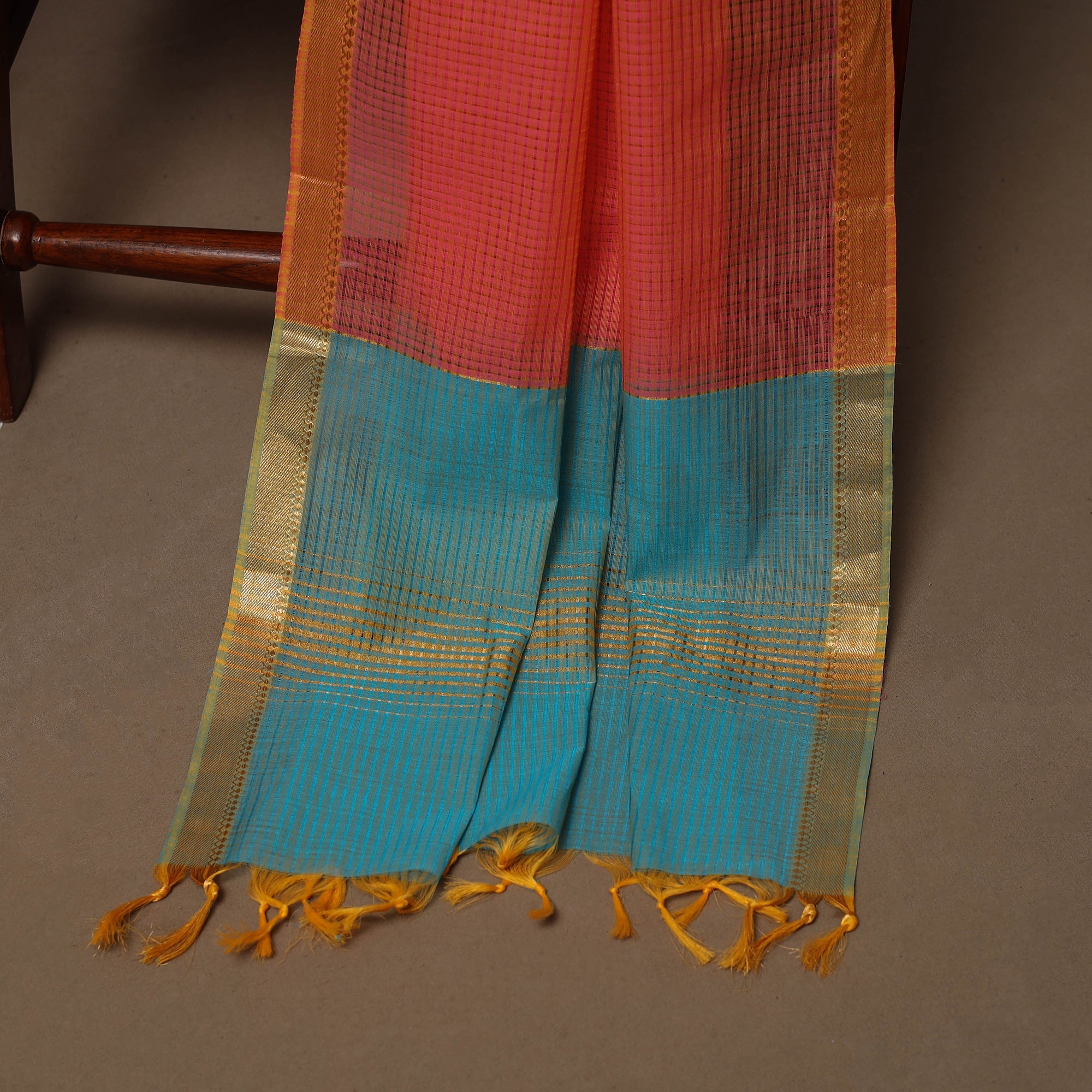 3pc natural dyed mangalagiri cotton unstitched dress material from Andhra Pradesh. Woven using the traditional Mangalagiri technique, it features a fine texture with classic zari borders. The set includes a kurta fabric, a plain matching bottom and a subtle missing checks dupatta. Ideal for small gatherings or relaxed everyday wear.