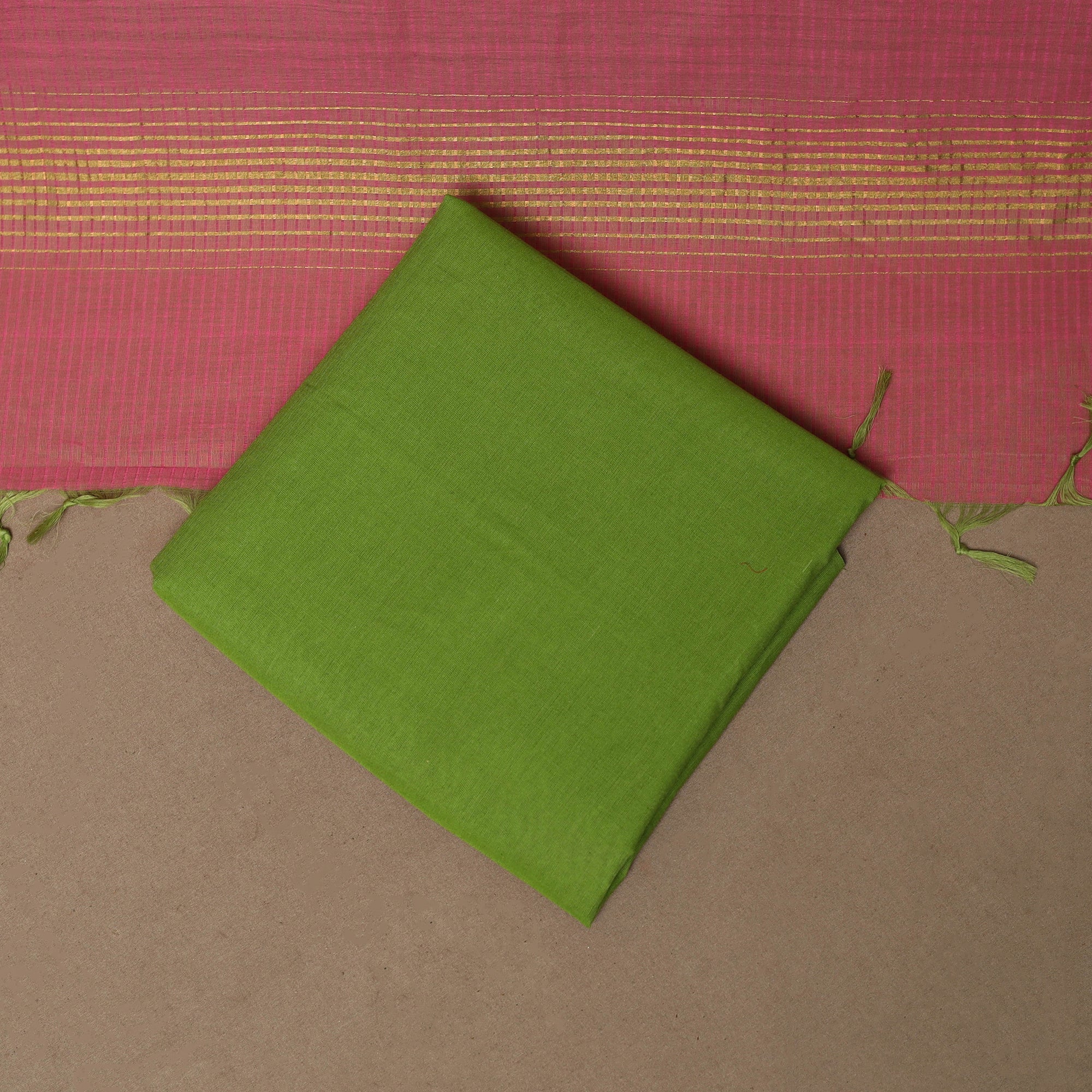 3pc natural dyed mangalagiri cotton unstitched dress material from Andhra Pradesh. Woven using the traditional Mangalagiri technique, it features a fine texture with classic zari borders. The set includes a kurta fabric, a plain matching bottom and a subtle missing checks dupatta. Ideal for small gatherings or relaxed everyday wear.