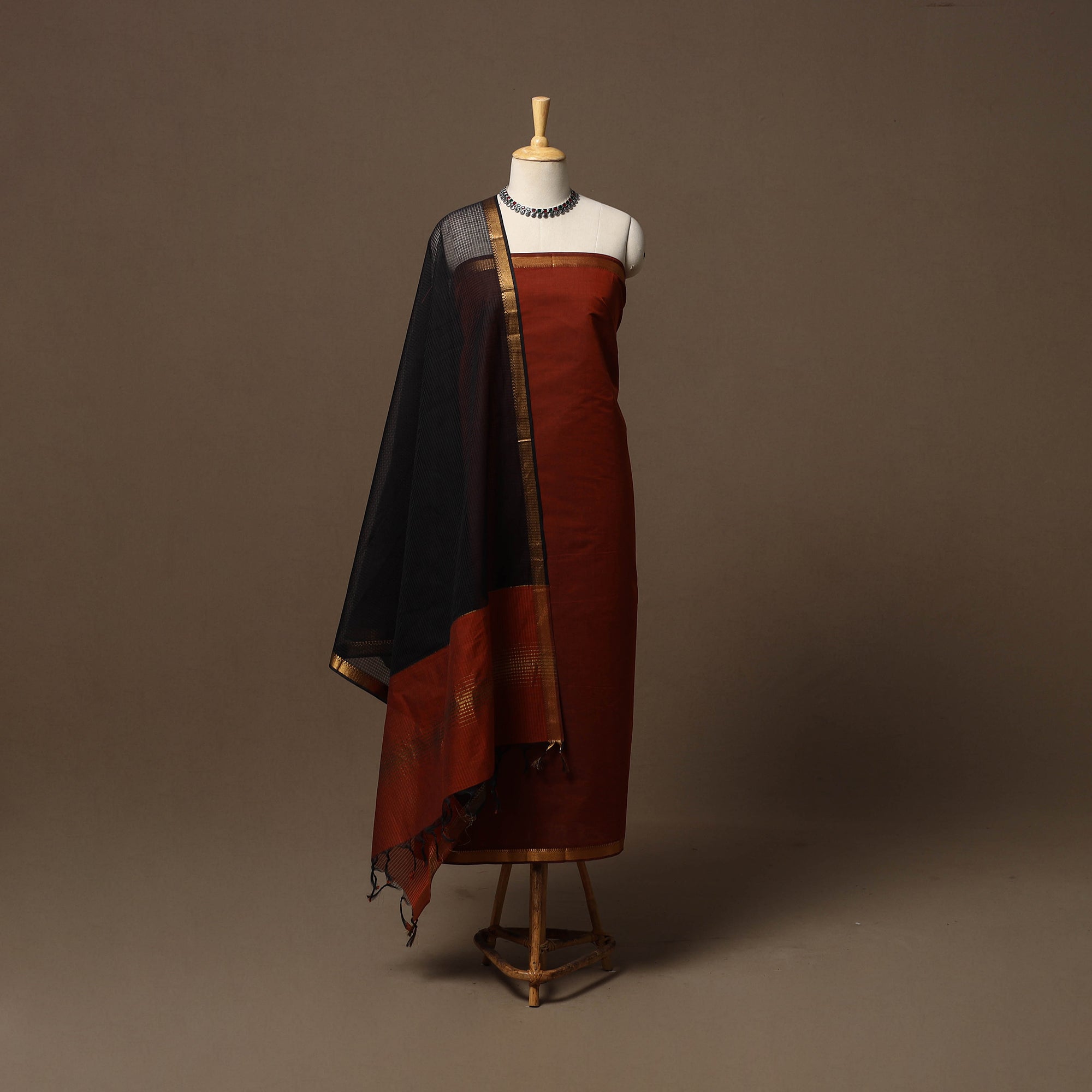 Maroon 3pc natural dyed mangalagiri cotton unstitched dress material from Andhra Pradesh. Woven using the traditional Mangalagiri technique, it features a fine texture with classic zari borders. The set includes a kurta fabric, a plain matching bottom and a subtle missing checks dupatta. Ideal for small gatherings or relaxed everyday wear.