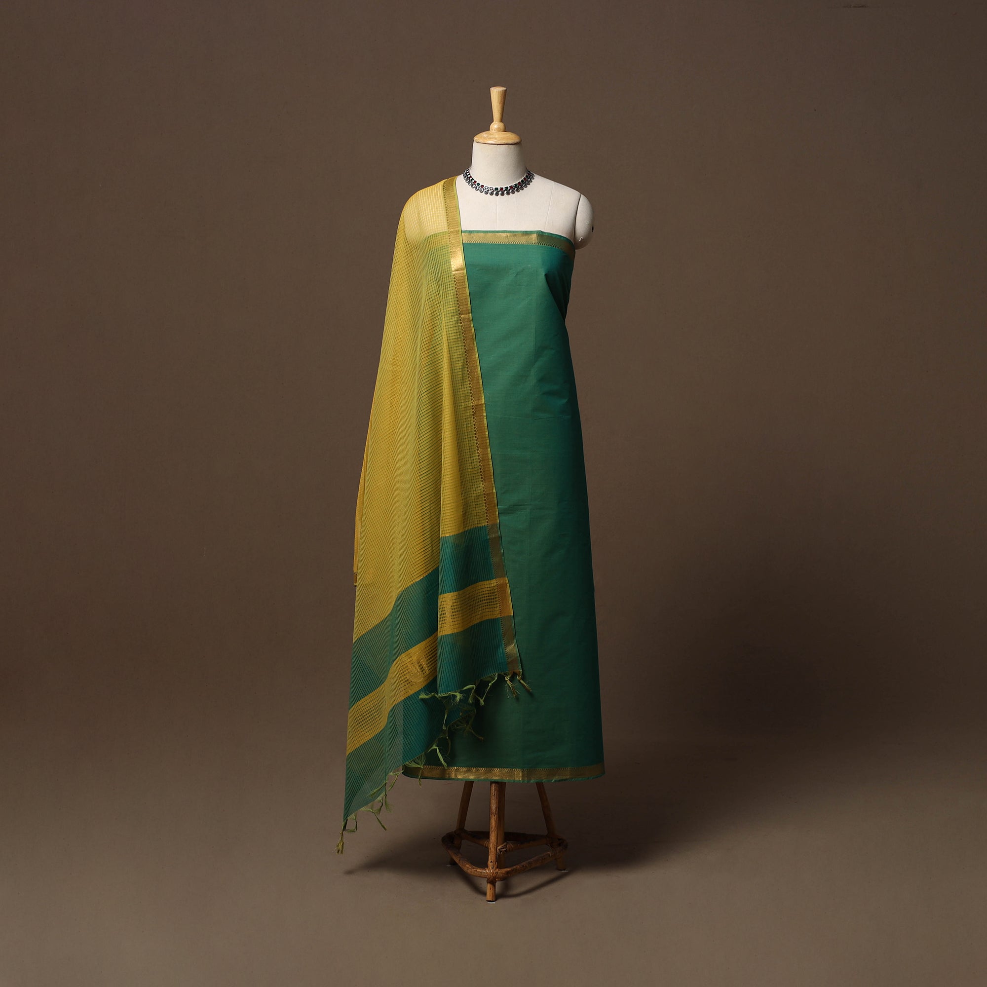 3pc natural dyed mangalagiri cotton unstitched dress material from Andhra Pradesh. Woven using the traditional Mangalagiri technique, it features a fine texture with classic zari borders. The set includes a kurta fabric, a plain matching bottom and a subtle missing checks dupatta. Ideal for small gatherings or relaxed everyday wear.