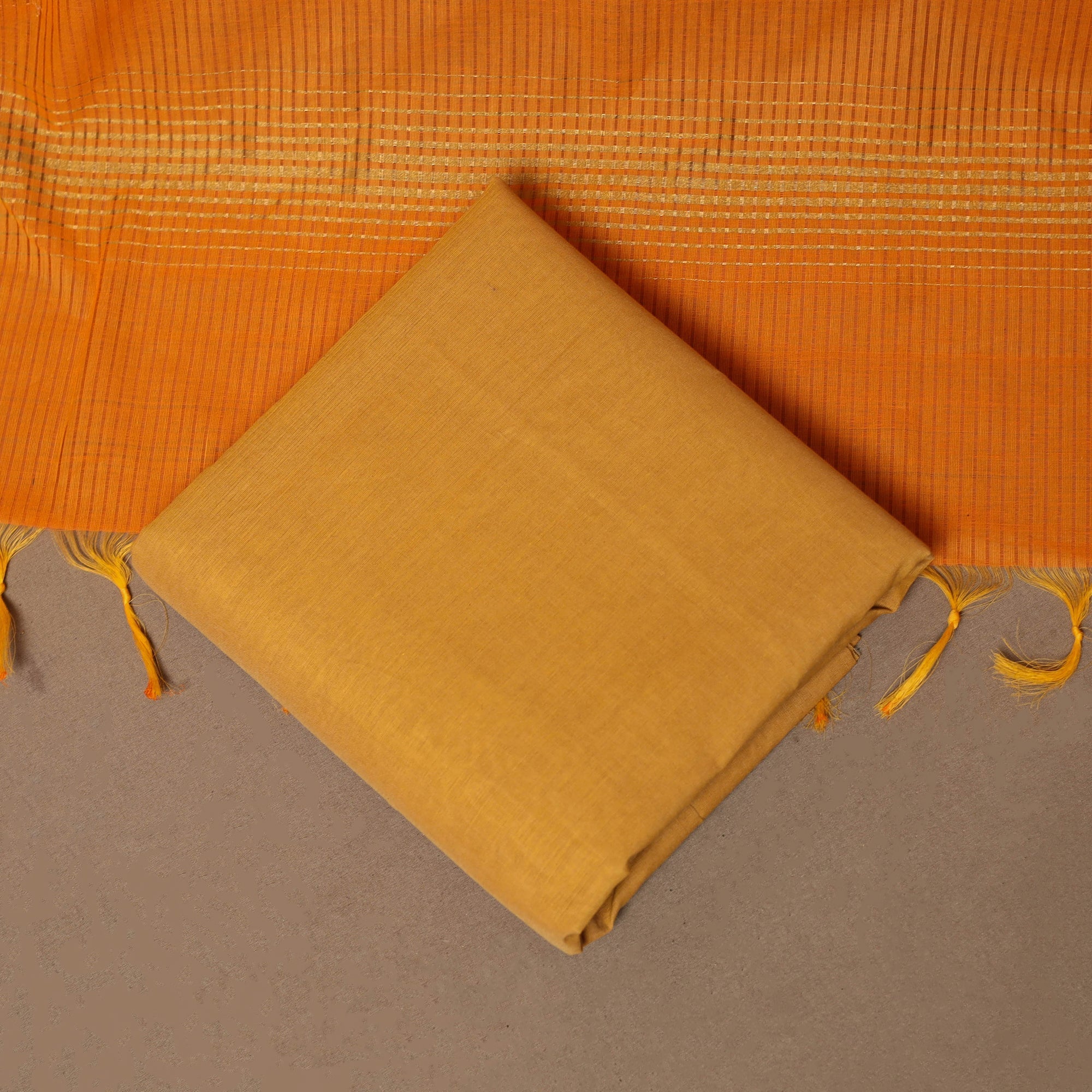 Orange 3pc natural dyed mangalagiri cotton unstitched dress material from Andhra Pradesh. Woven using the traditional Mangalagiri technique, it features a fine texture with classic zari borders. The set includes a kurta fabric, a plain matching bottom and a subtle missing checks dupatta. Ideal for small gatherings or relaxed everyday wear.