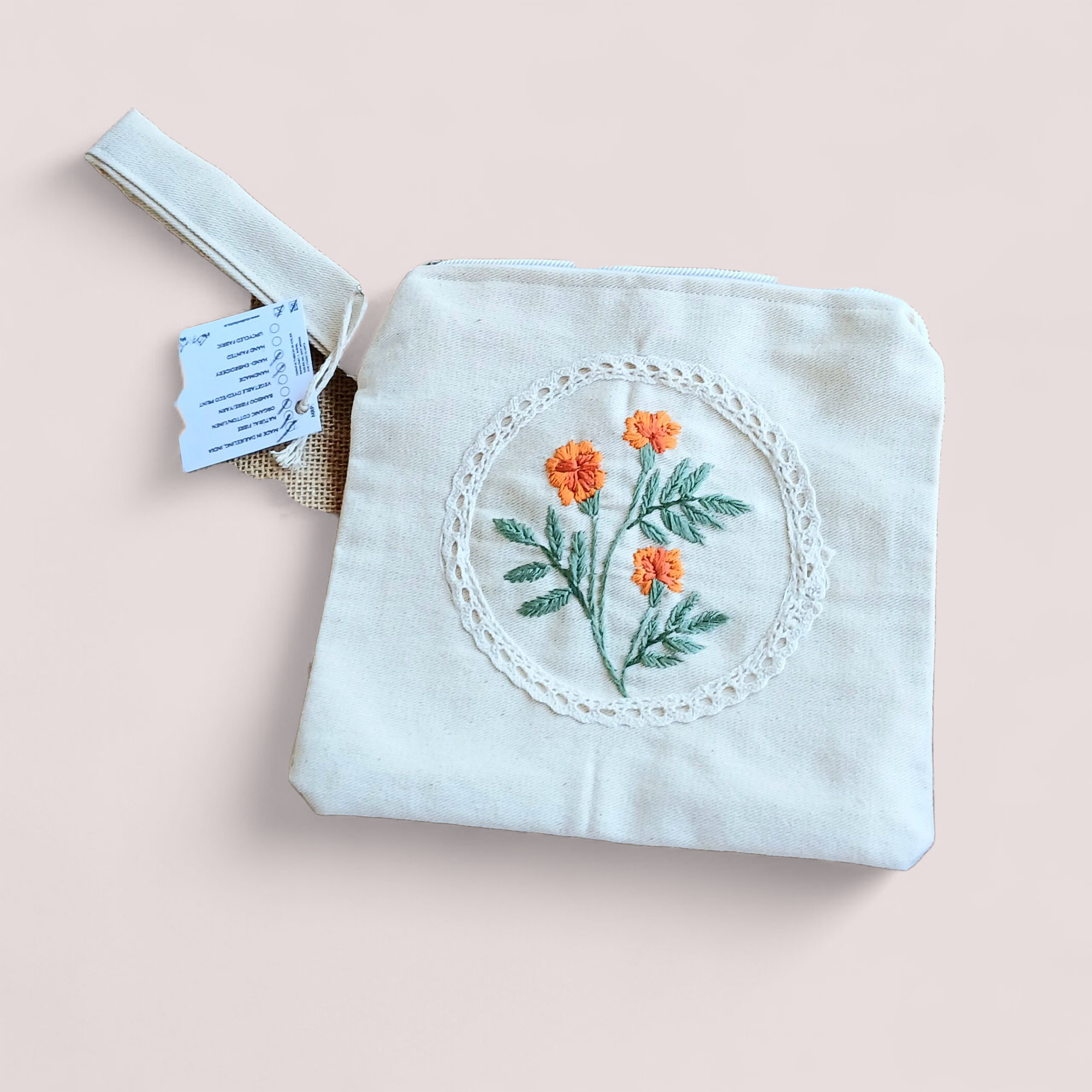 • Marigold garden hand embroidered utility pouch - handcrafted