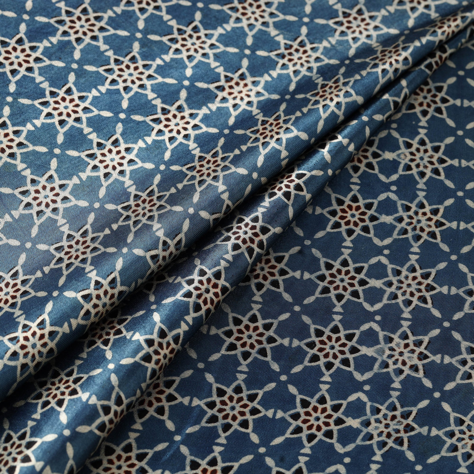 Blue ajrakh fabric crafted using natural-dyeing and resist block-printing techniques. This ancient craft is estimated to be around 4,500 years old. The Ajrakh artisans in India originally migrated from Sindh to the Kutch region of Gujarat and to Barmer in Rajasthan. Ajrakh is also the traditional attire of the Maldhari pastoral community of Bhuj. The process is long and detailed, involving multiple stages where each layer of colour is printed only after a resting period, allowing the cloth to absorb the dye fully. Made of mashru silk, which blends the richness of silk with the comfort of cotton, it is ideal for creating kurtas, shirts, dresses or even home decor items.