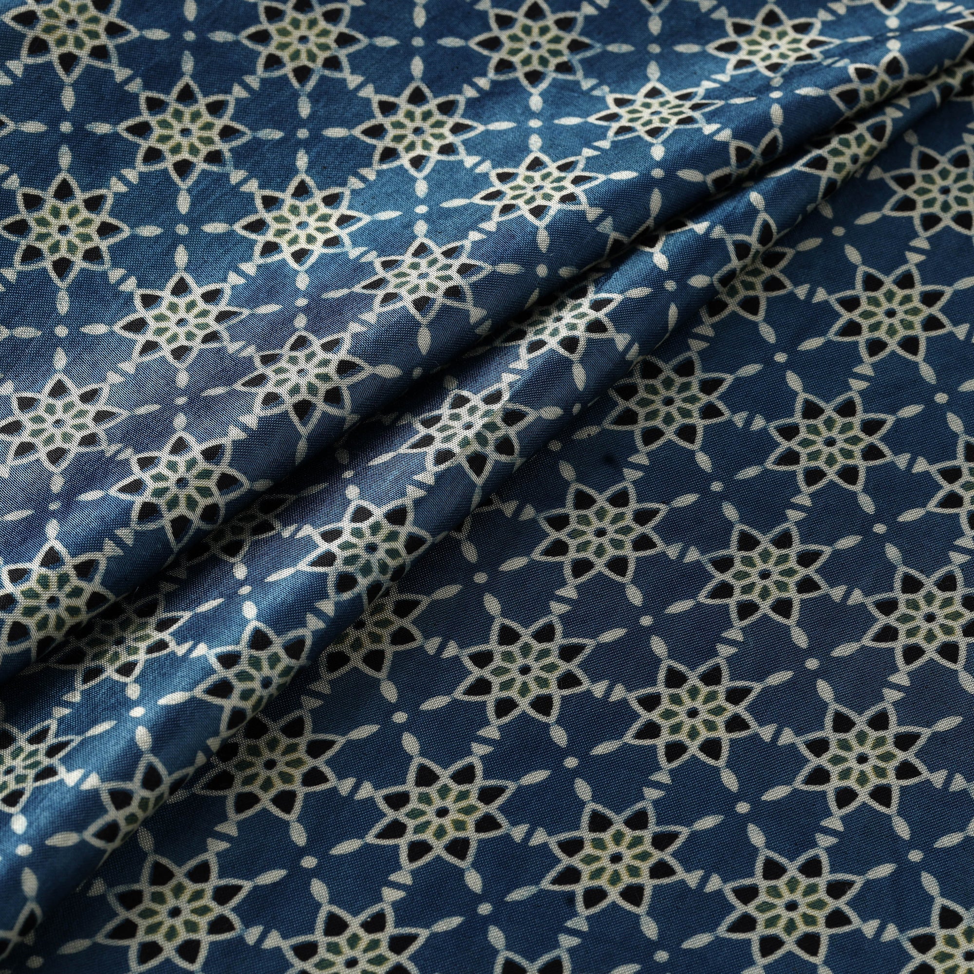 Blue ajrakh fabric crafted using natural-dyeing and resist block-printing techniques. This ancient craft is estimated to be around 4,500 years old. The Ajrakh artisans in India originally migrated from Sindh to the Kutch region of Gujarat and to Barmer in Rajasthan. Ajrakh is also the traditional attire of the Maldhari pastoral community of Bhuj. The process is long and detailed, involving multiple stages where each layer of colour is printed only after a resting period, allowing the cloth to absorb the dye fully. Made of mashru silk, which blends the richness of silk with the comfort of cotton, it is ideal for creating kurtas, shirts, dresses or even home decor items.
