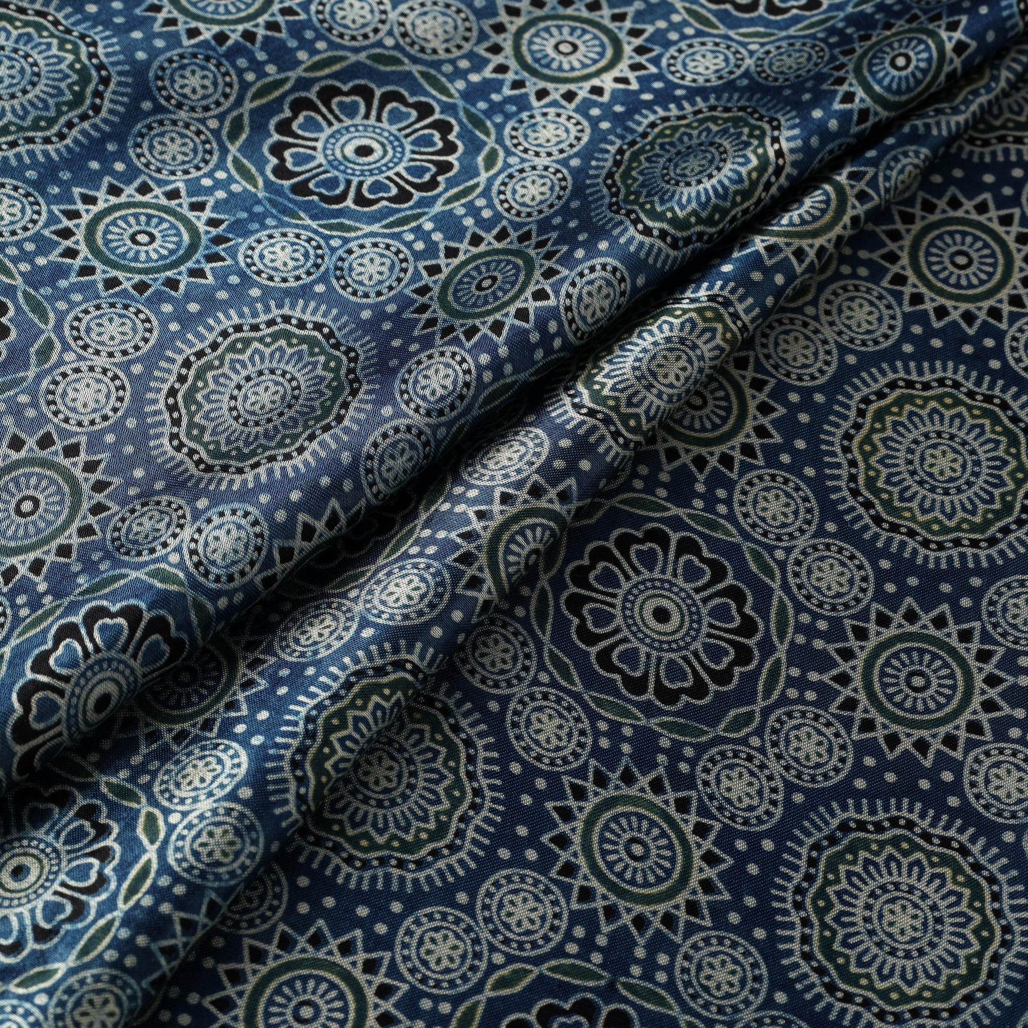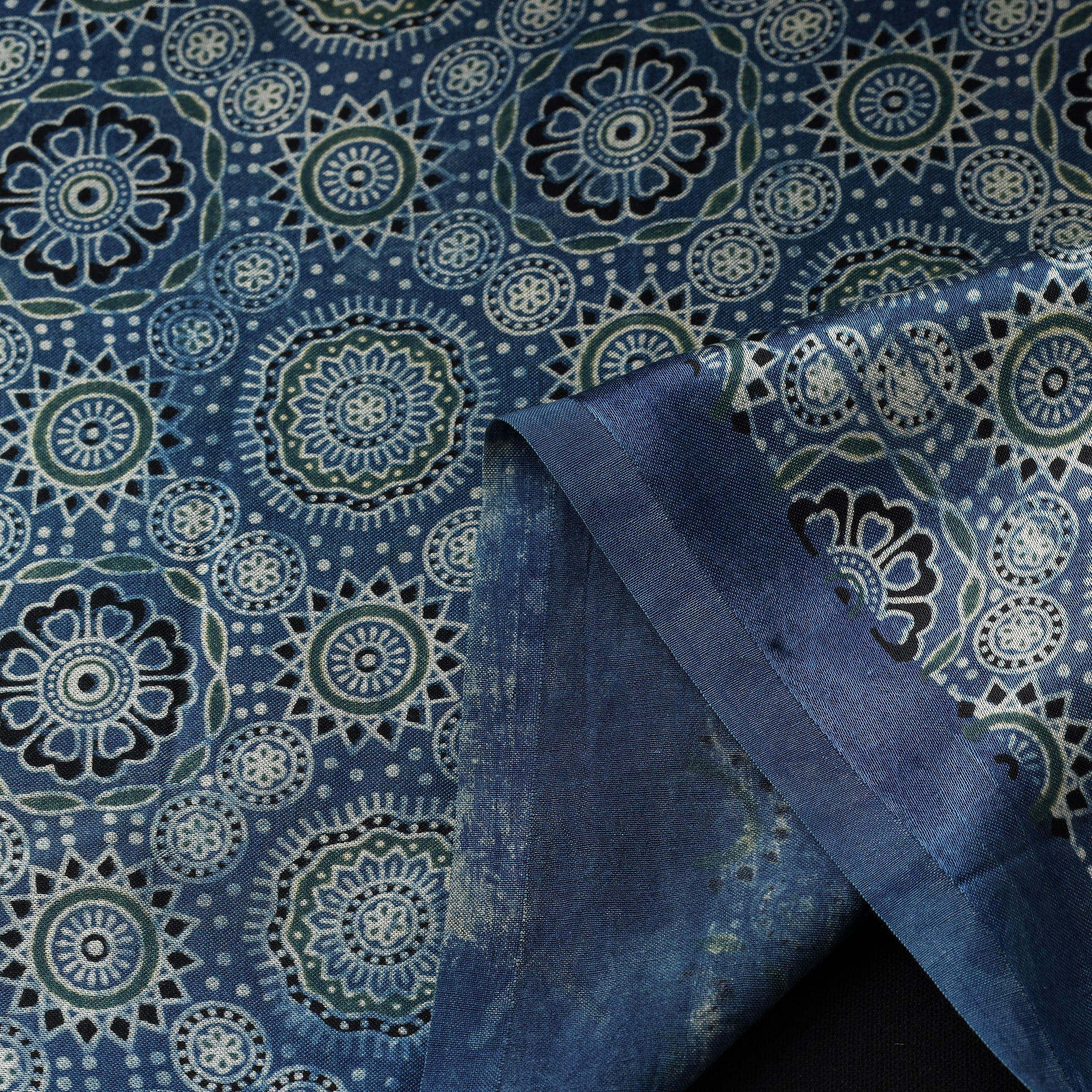 Blue ajrakh fabric crafted using natural-dyeing and resist block-printing techniques. This ancient craft is estimated to be around 4,500 years old. The Ajrakh artisans in India originally migrated from Sindh to the Kutch region of Gujarat and to Barmer in Rajasthan. Ajrakh is also the traditional attire of the Maldhari pastoral community of Bhuj. The process is long and detailed, involving multiple stages where each layer of colour is printed only after a resting period, allowing the cloth to absorb the dye fully. Made of mashru silk, which blends the richness of silk with the comfort of cotton, it is ideal for creating kurtas, shirts, dresses or even home decor items.